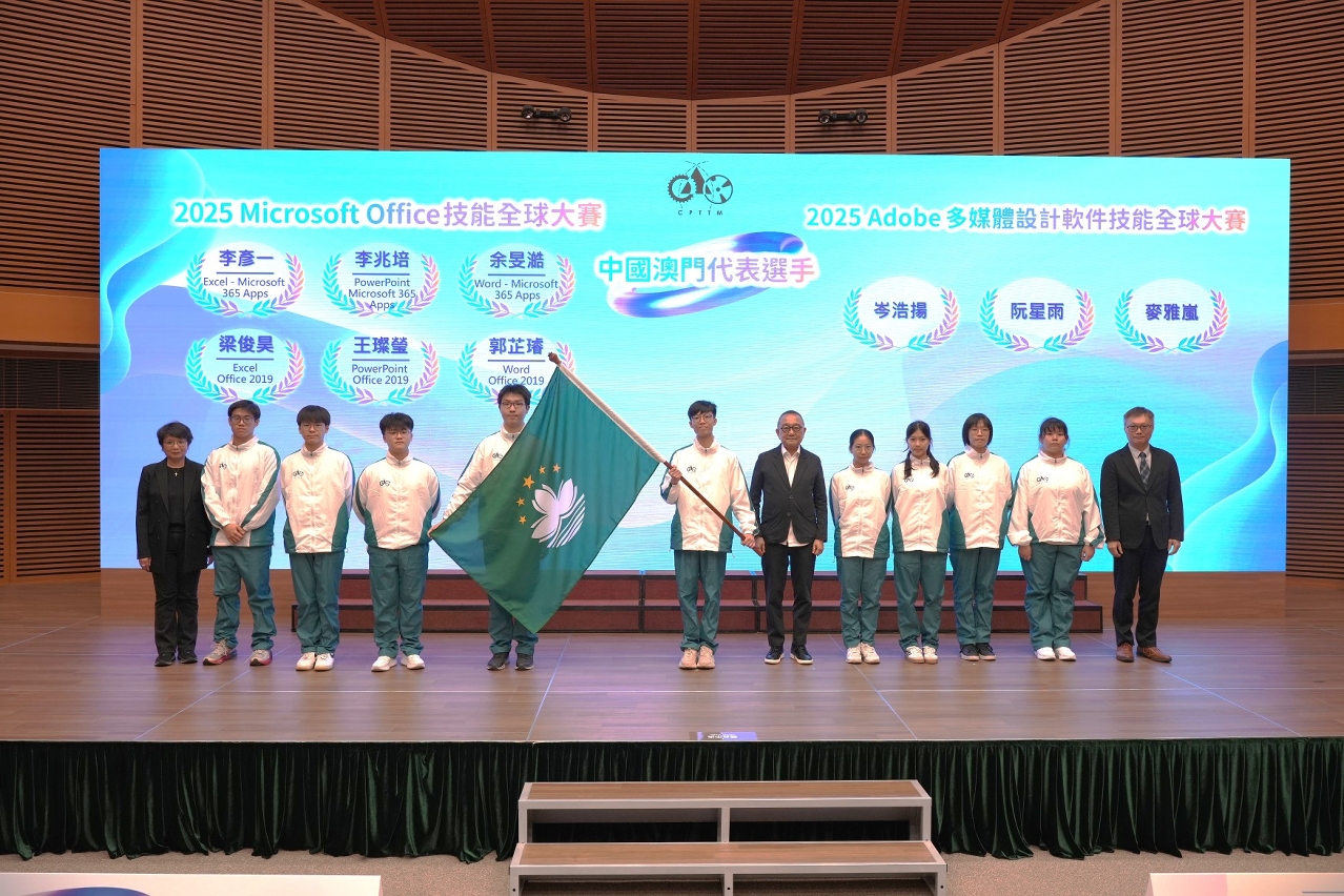 在启动仪式上,生产力中心主席杨俊文代表经济财政司司长向出战“2025 Microsoft Office及Adobe软件技能全球大赛”的澳门学生代表授予特区区旗,勉励他们全力以赴,发挥实力,祝愿中国澳门代表团在国际舞台上再创佳绩。