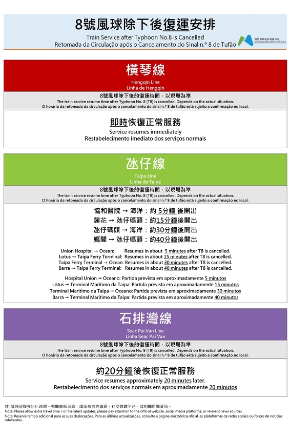 当8号风球除下后,在一般情况,横琴线将随即复运;石排湾线约20分钟后复运;氹仔线则将按序在协和医院站(往海洋站:约5分钟后)、莲花站(往氹仔码头站:约15分钟后)、氹仔码头站(往海洋站:约30分钟后)开出首班列车;而西湾大桥下层通道的轻轨路段,需待下层车道清场并经轻轨公司对通道作安全检查后才可通行列车,因此,妈阁站往氹仔码头站的首班列车将在8号风球除下约40分钟后开出。为保障乘客安全,复运首班列车的发出时间或因应各路段检查后的实际情况而作出调整。倘出现突发情况,轻轨公司将作出通报并对外公布信息。