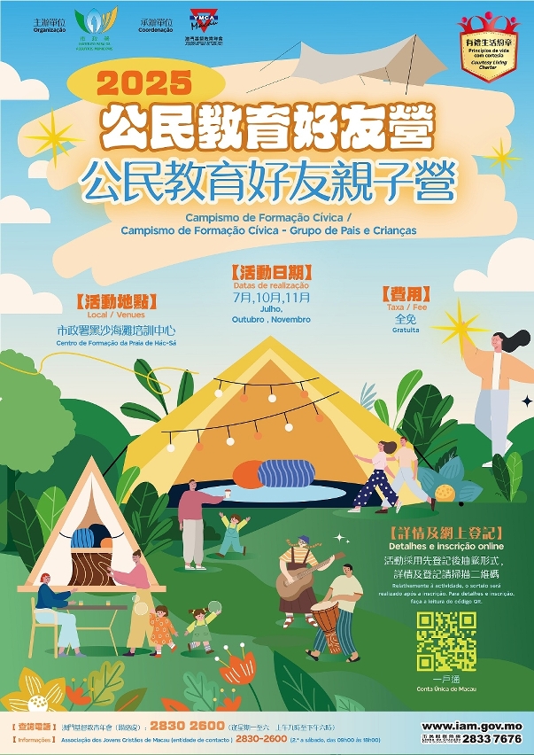 公民教育好友营以及亲子营采用先登记后抽签形式,费用全免,七月份场次现已接受报名,市民可透过扫描海报二维码或直接进入一户通进行报名。如有查询,可致电市政署市民服务热线2833 7676或澳门基督教青年会2830 2600。