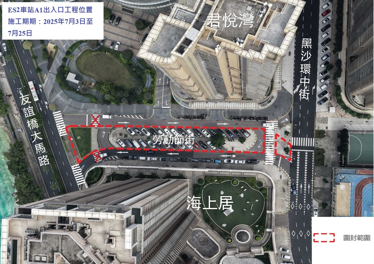 是次三个出入口工程分别是位于劳动节街的ES2站A1出入口(见图1)、位于东方明珠街的ES2站B1出入口(见图2)以及位于如意广场的ES1站E出入口(见图3),将自7月起分阶段施工。首阶段会进行管线迁移、地下管线铺设、重整行车道及依照市政署指引及要求对合适的树木进行迁移等。配合施工,7月3日至12月31日,如意广场、友谊桥大马路与黑沙环中街之间的一段劳动节街实施有限度通车,如意广场及劳动节街部份咪表泊车位暂停使用;7月14日至12月31日,劳动节街近黑沙环中街的电单车泊车位暂停使用;而工程范围之休憩区则暂停开放。