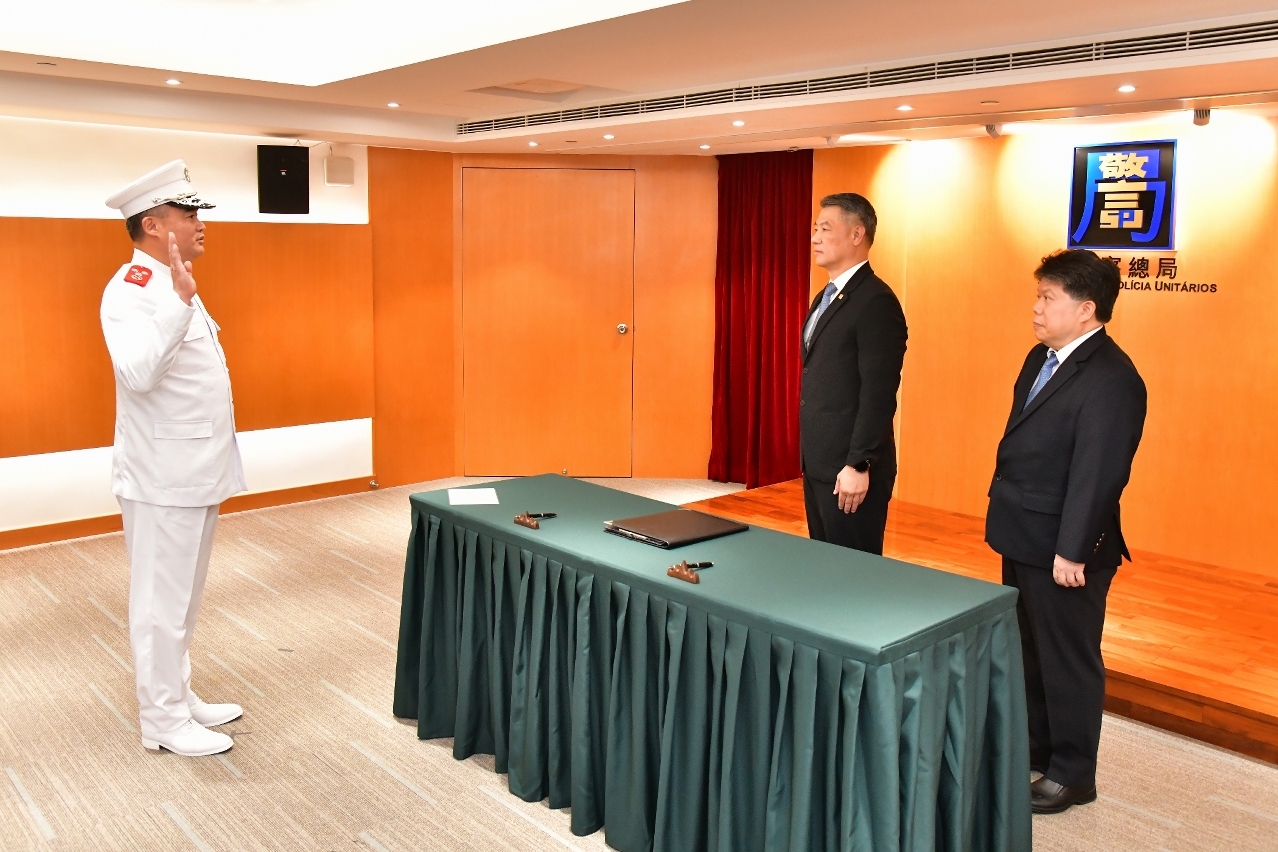 根据保安司司长批示,自2025年7月16日起,委任治安警察局警务总长魏瑞斌为警察总局局长助理,赋予副警务总监的职能职位,主管情报分析中心;以及委任消防局消防总长林俊生为警察总局局长助理,赋予副消防总监的职能职位,主管民防及协调中心。就职仪式于今(16日)在警察总局举行,由警察总局局长梁文昌主持仪式,两位局长助理宣誓就任。出席仪式人员还包括警察总局局长助理梁文照、局长办公室协调员赵汝民、金融情报办公室副主任冯婉琪以及各部门主管及同事。