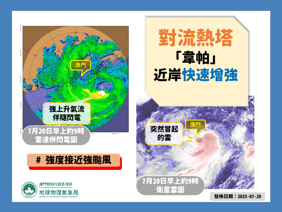 「韦帕」进入南海北部后,发展速度明显加快,更曾于移近珠江口沿岸时出现俗称「对流热塔」的现象,从卫星云图上看,会出现一团冒起的云,尤如云上的一座塔。(图3)