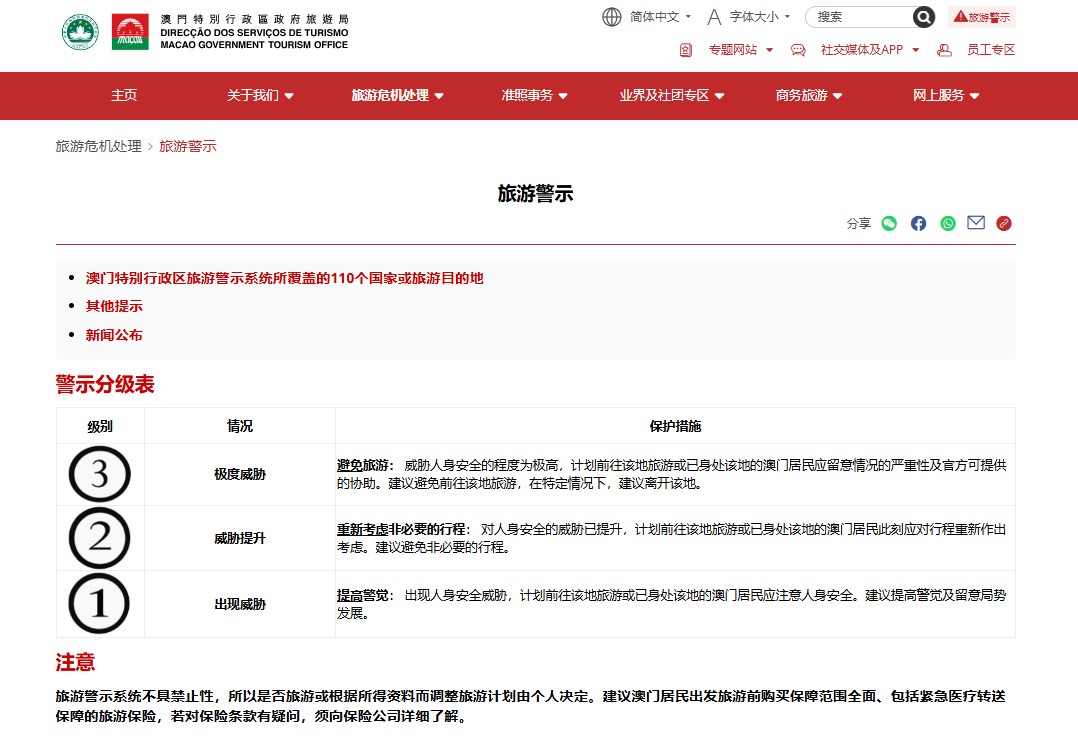 澳门特别行政区旅游警示分级如下: