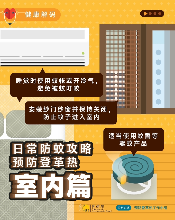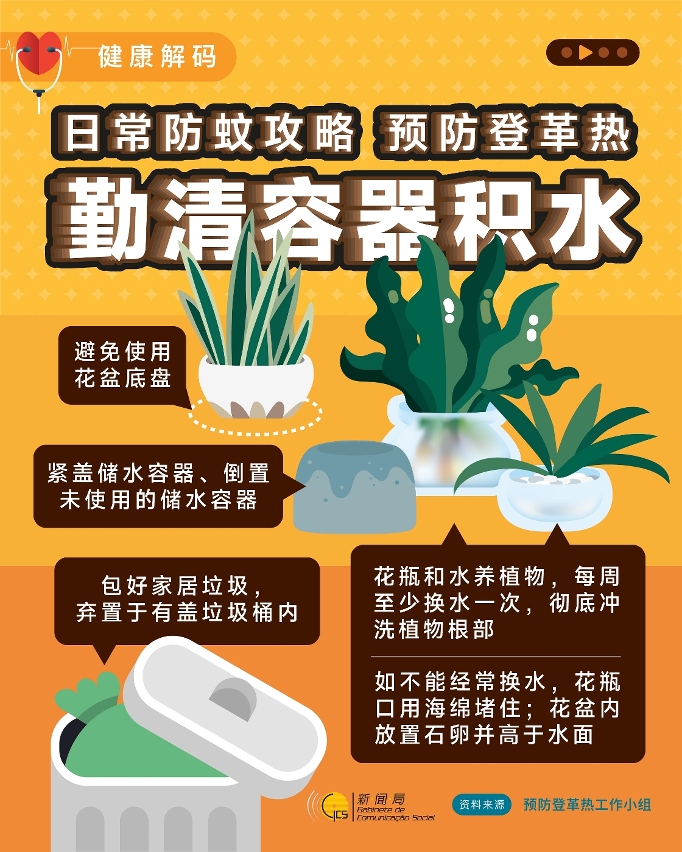 除此之外,亦提醒医疗机构加强对疑似病例尽早安排检测及早调查,主动搜索怀疑病例,以采取针对性措施阻断进一步传播,卫生局公共卫生化验所向本澳所有医疗机构提供登革热和基孔肯雅热免费检测。卫生局并再次呼吁居民加强注意防范,做好“防蚊三招” ,共同防控基孔肯雅热和登革热等蚊媒传播疾病: