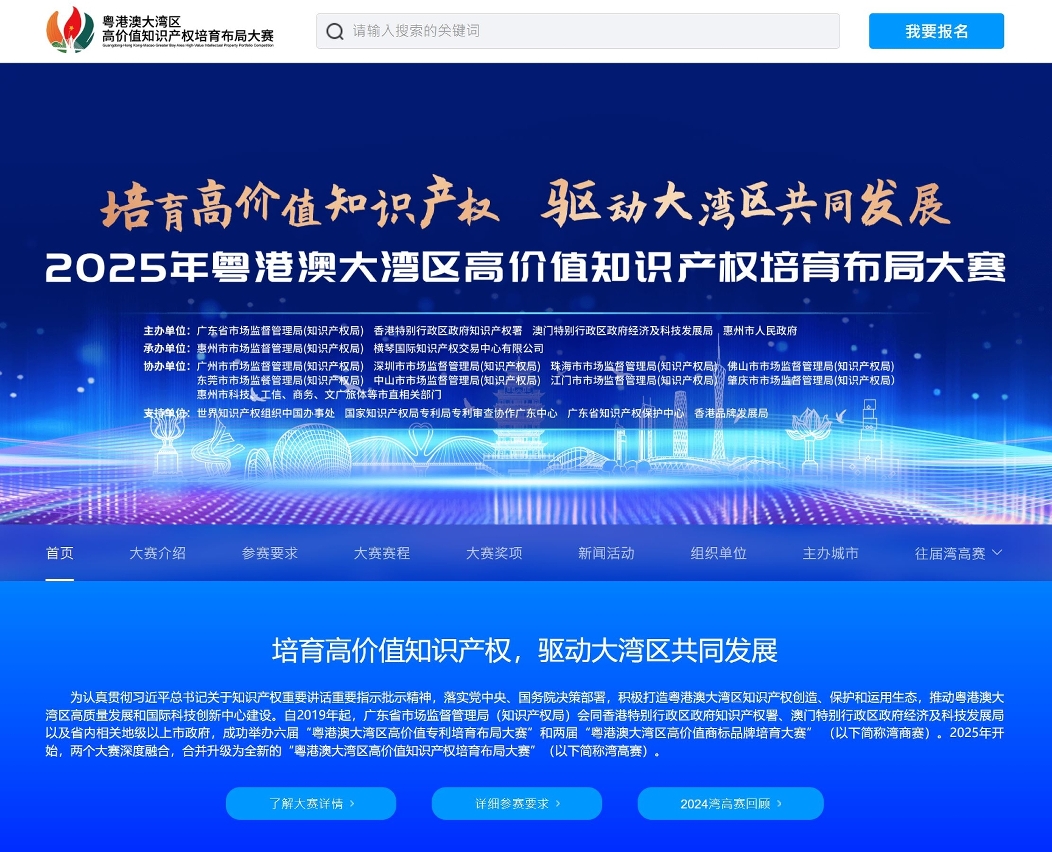 “粤港澳大湾区高价值知识产权培育布局大赛”是粤港澳三地在知识产权领域携手推进大湾区建设的重大品牌活动,不但为参加者提供展示及交流合作平台,参赛项目更可享有大湾区九市政策扶持及资源对接服务,助力项目落地发展。本届大赛设金奖10项,银奖20项,优秀奖30项。此外,还设有投资潜力奖、转化运用奖、网络人气奖等专项奖励50项。大赛报名截止日期为2025年8月15日,欢迎各类创新主体及商标品牌积极参赛。
