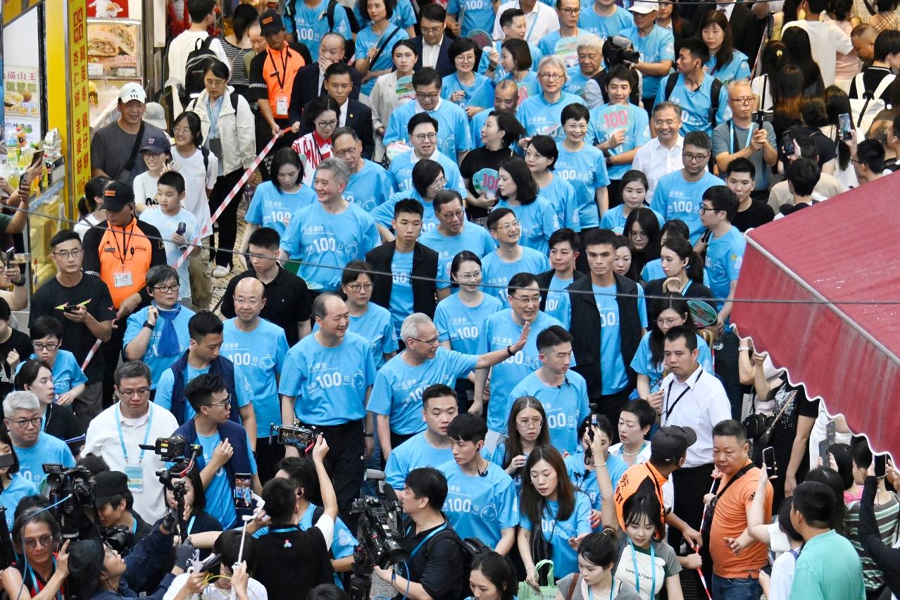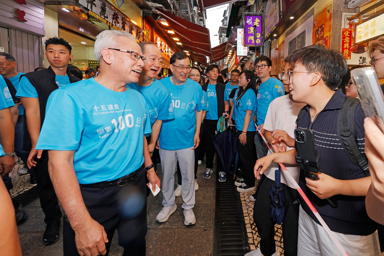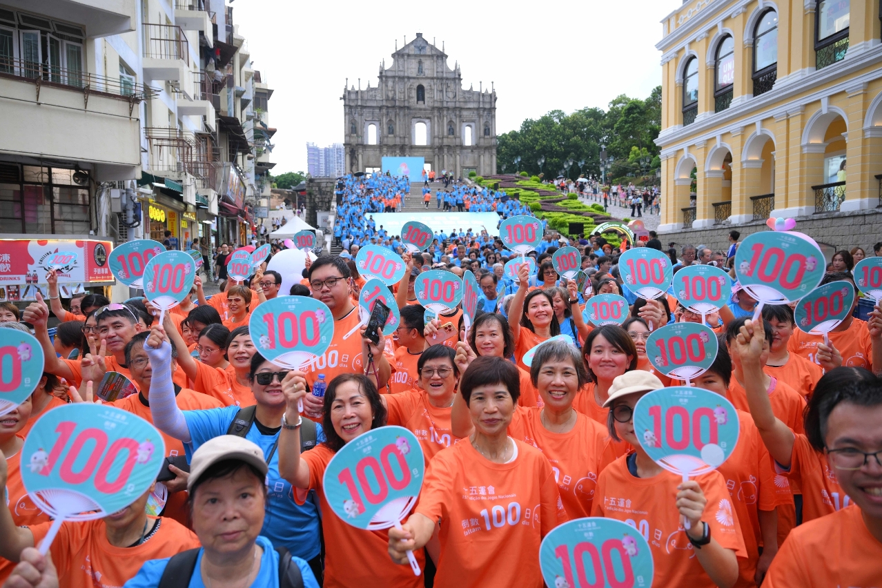“迎百日健步行”活动率先于下午5时在本澳世遗景点大三巴牌坊前地展开,气氛热烈,展现了澳门市民、旅客对全运会的热切期盼,社会团结一致,携手迎全运的凝聚力。现场志愿者齐心协力拼出寓意深远的数字“100”,象征十五运会正式踏入百日倒数,全城期待十五运会和残特奥会的来临。