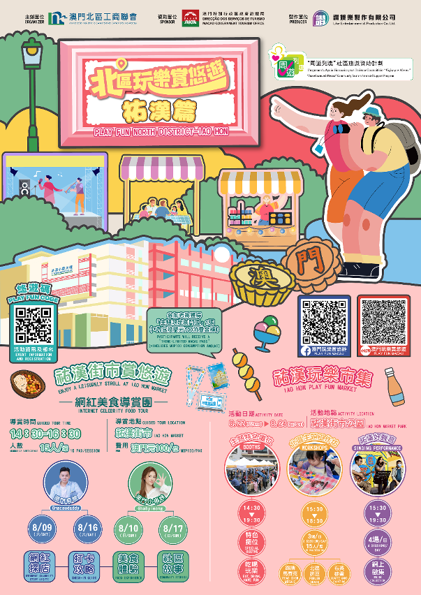 “北区玩乐赏悠游 – 祐汉篇”设有“祐汉玩乐市集”,于8月22日至24日下午2时30分至晚上7时30分在祐汉街市公园举行,内容包括主题特色摊位、北区主题工作坊及“祐汉好声音”, 吸引旅客和居民参与,引导旅游消费进入社区。活动亦设有“祐汉街市赏悠游 – 网红美食导赏团”,于8月9至10日及16至17日下午2时30分至4时30分举行,邀请澳门网红到祐汉街市公园分享打卡攻略,并带领参加者品尝特色美食,体验社区“旅游+美食”魅力,探索社区故事。