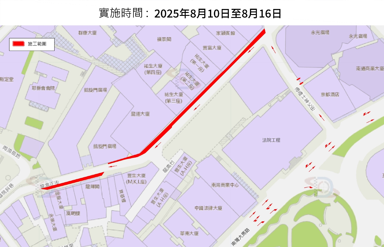 南湾大马路法院大楼工程的管线接驳工作自本年6月16日起分三阶段有序推进,首阶段施工已于7月12日按时完成。现时正进行第二阶段施工,预计可于8月10日按时完成,并于同日紧接开展第三阶段施工。届时,南湾大马路将恢复正常通车,龙嵩正街继续维持有限度通车,龙嵩正街近凯旋门广场的轻型汽车咪表泊车位和电单车泊车位继续维持禁止泊车。