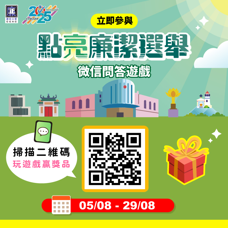 第八届立法会选举将于9月14日举行,廉政公署为此推出“点亮廉洁选举”微信问答游戏,以加深市民廉洁选举的意识,共同维护选举的公平、公正和廉洁。
