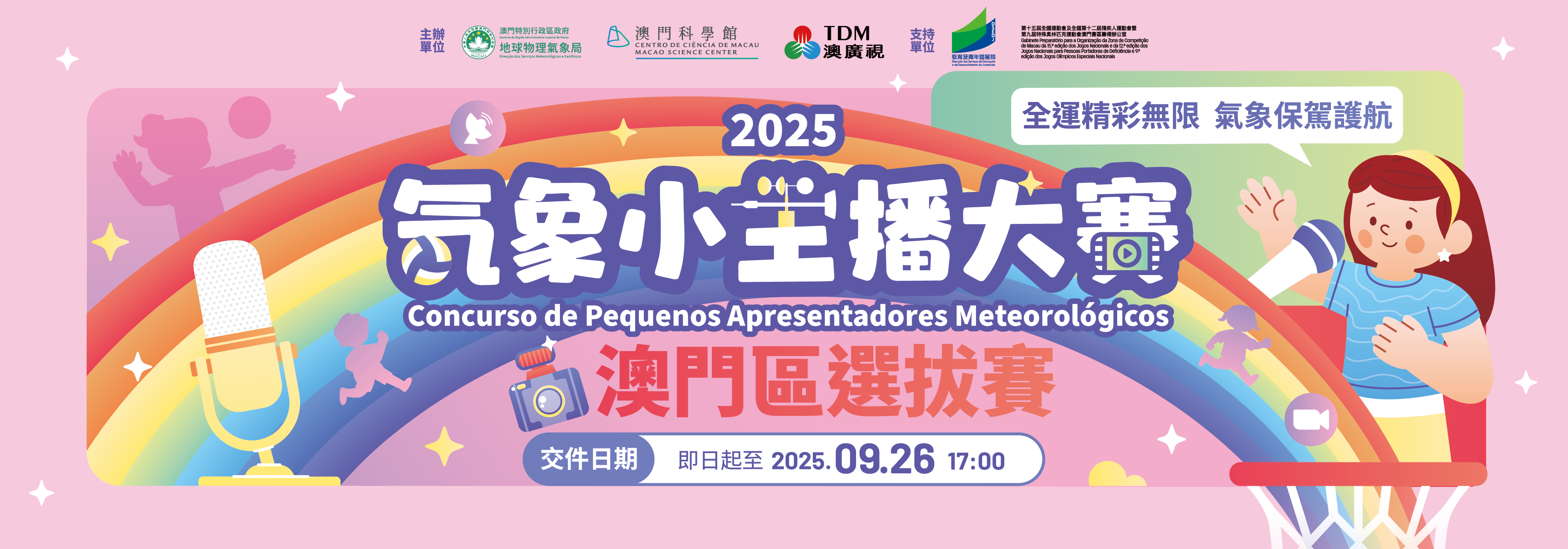 为提高学生气象科普的创作及传播能力,激发学生探索气象科学的兴趣,地球物理气象局、澳门科学馆及澳门广播电视股份有限公司联合举办,并获教育及青年发展局、第十五届全国运动会及全国第十二届残疾人运动会暨第九届特殊奥林匹克运动会澳门赛区筹备办公室支持的2025“气象小主播大赛”澳门区选拔赛即日(15日)起接受报名,欢迎有兴趣的本澳学生踊跃参与,并于9月26日下午5时或之前报名及上载参赛视频作品。
