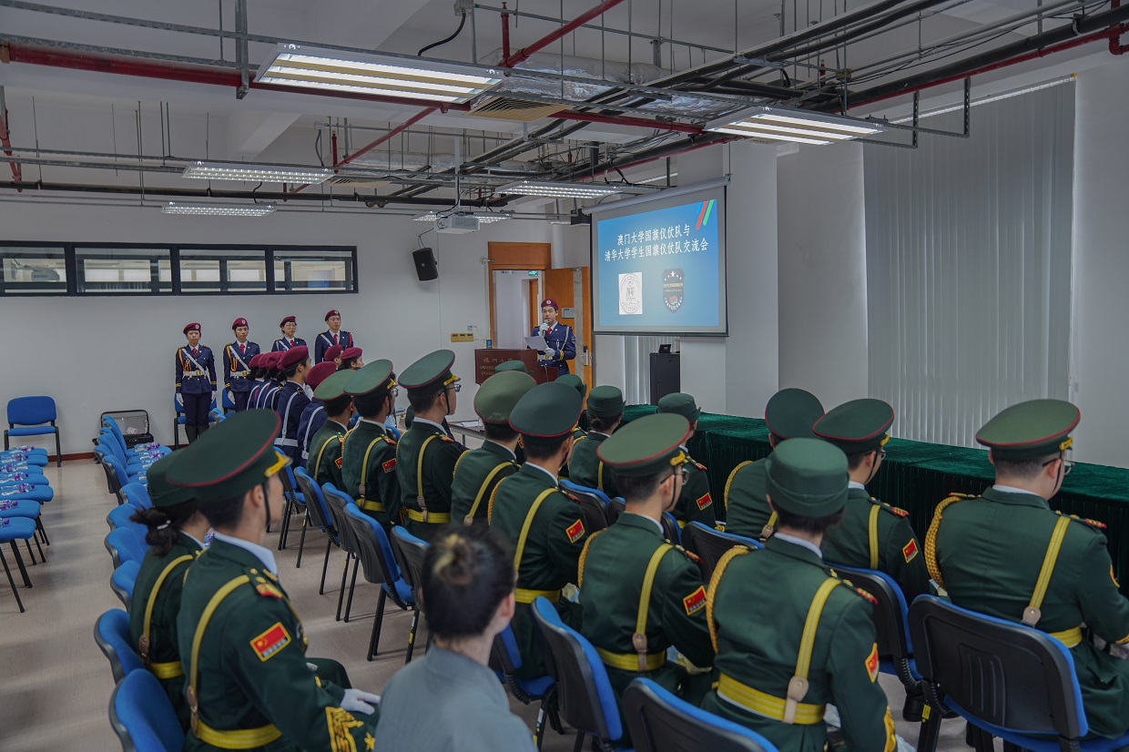 澳门大学国旗仪仗队与清华大学学生国旗仪仗队举行联合升旗仪式并进行交流,以弘扬爱国精神、深化友谊协作,共同推动国旗文化的传承与发展。