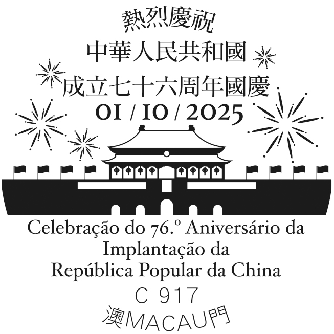 为庆祝中华人民共和国成立七十六周年国庆,邮电局特于二零二五年十月一日上午九时至下午二时,在邮政总局集邮商店设置临时柜台,为市民提供加盖“热烈庆祝中华人民共和国成立七十六周年国庆”纪念邮戳服务。