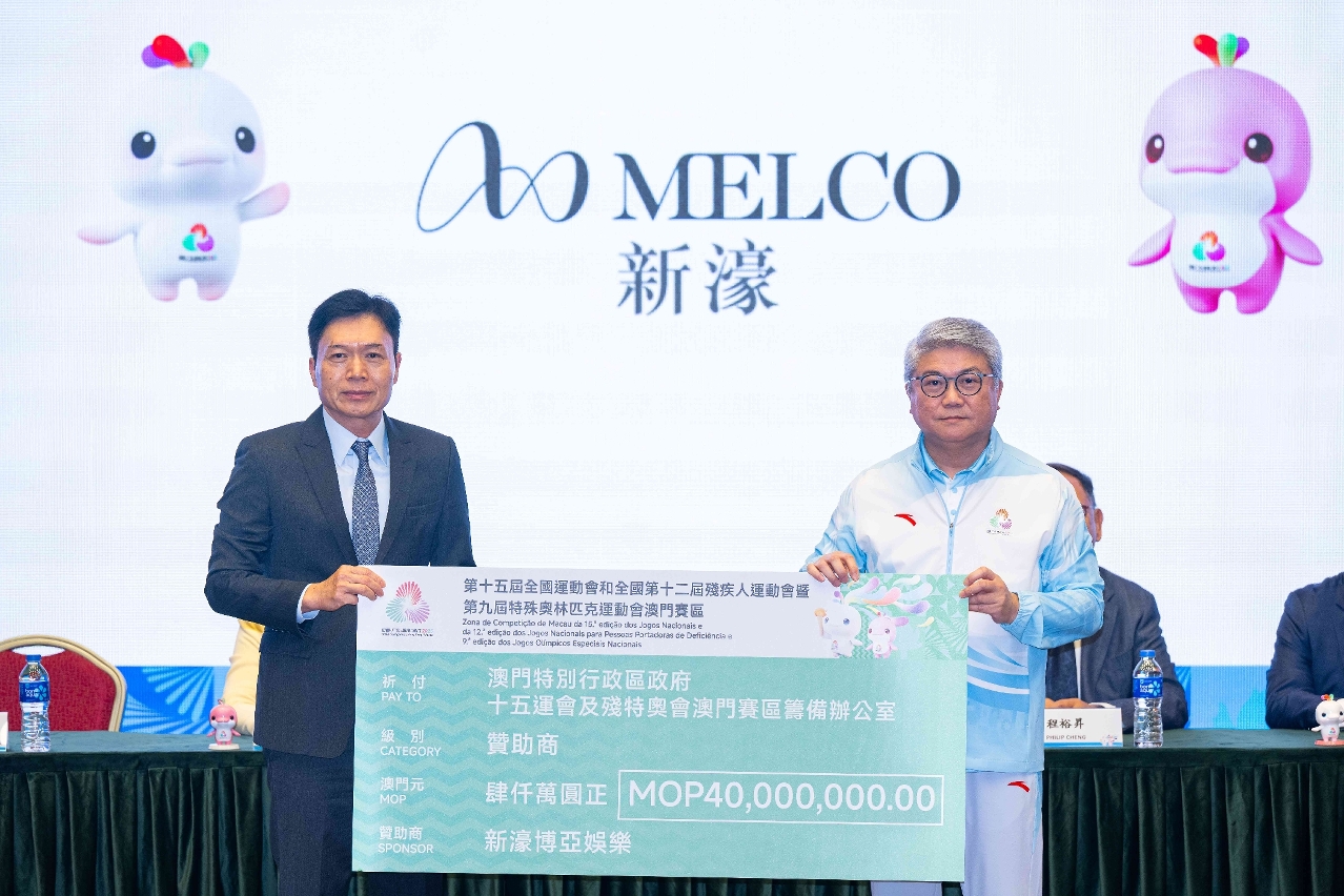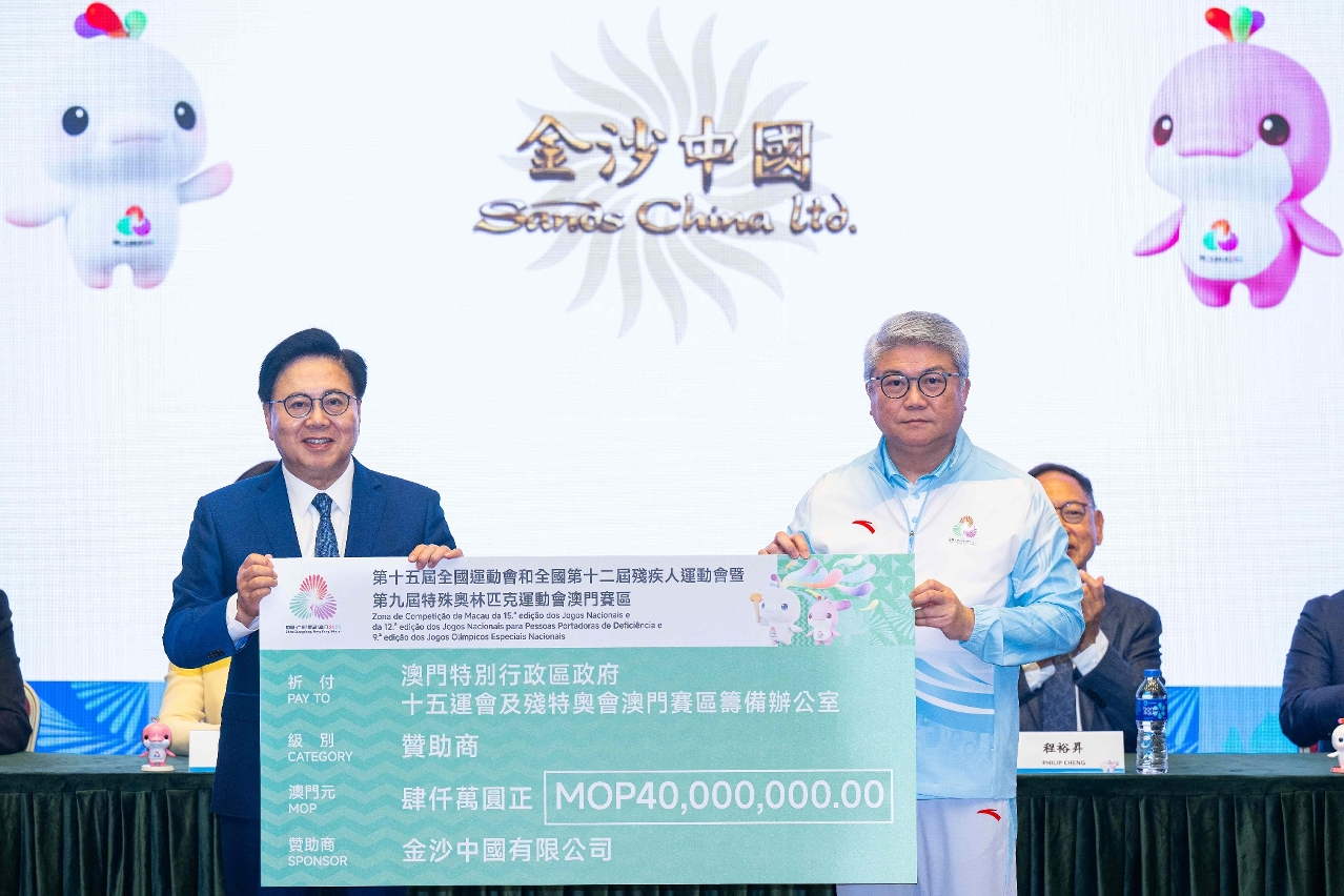 潘主任致辞时表示,感谢本澳各政府部门和社会各界在筹备十五运会及残特奥会过程的大力支持,并宣布十五运会及残特奥会澳门赛区赞助商,分别为永利渡假村(澳门)股份有限公司、银河娱乐集团、新濠博亚娱乐、美高梅中国控股有限公司、澳娱综合度假股份有限公司、金沙中国有限公司,会上亦进行赞助商支票递交仪式。运动会期间将吸引大量旅客及球迷来澳,促进体育经济与文旅消费双向赋能,进一步推动本地经济多元发展。在十五运会开幕前的最后冲刺阶段,澳门赛区将全力推进各项办赛工作,为参赛和观赛人士呈现一场精彩的体育盛会,让所有参与者感受到澳门的活力与魅力。