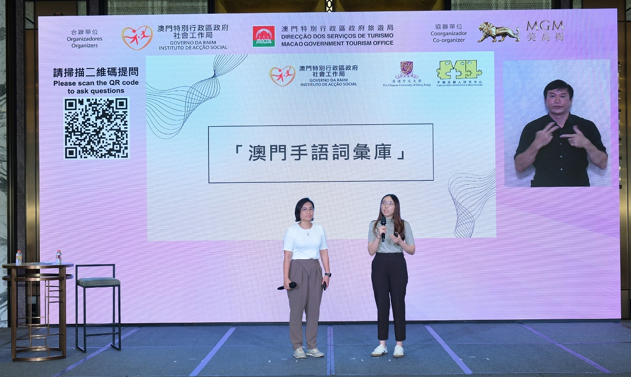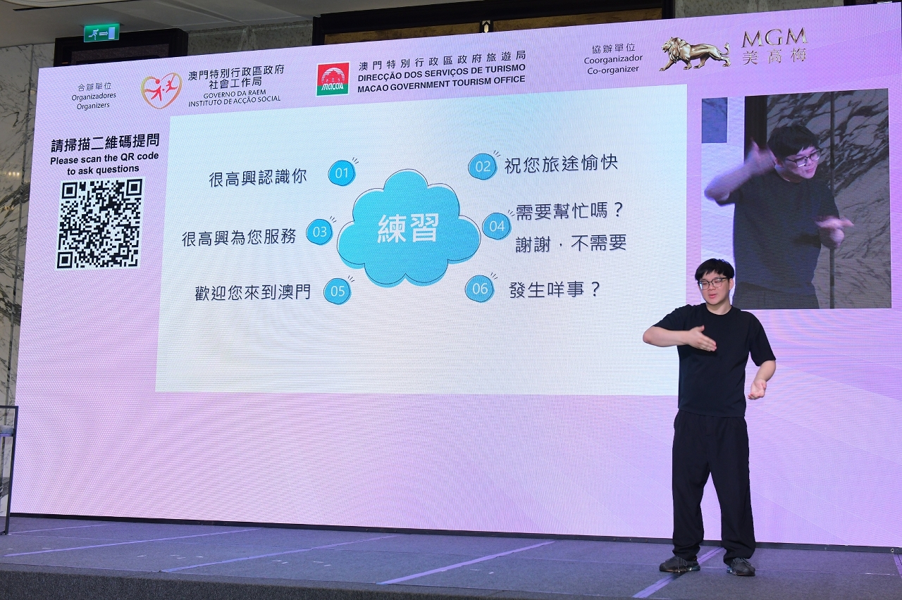 “心手相连、携手共融”国际手语日推广培训活动邀请了复康事务委员会委员、无障碍事务工作小组成员、「星级旅游服务认可计划」支持单位的代表,以及旅游从业人员参与,共约230名人员参加。培训内容包括:「澳门手语词汇库」操作、听障人士的需要及特性、接待听障人士的方法与技巧及常用旅游服务手语等内容,藉此让社会人士了解本澳聋人本土手语文化,关注听障人士的特性与需要,共同推进本澳无障碍共融社区发展。