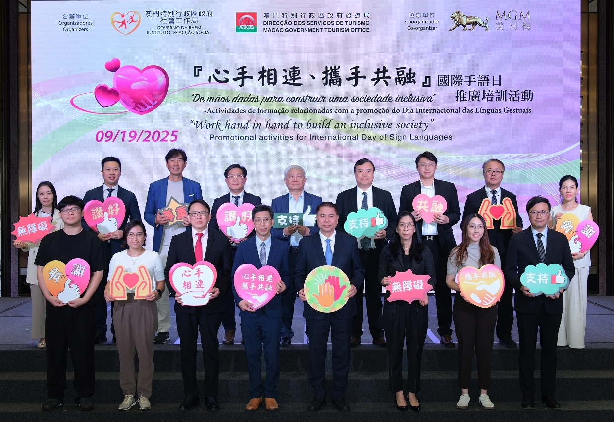 为推动本澳无障碍共融社区建设,便利残疾人士、市民及旅客的生活与出行,社会工作局持续为公共部门及公共事业单位开展无障碍推广的相关培训。适逢9月23日『国际手语日』,由社会工作局与旅游局合办,美高梅协办的“心手相连、携手共融”国际手语日推广培训活动于9月19日下午假美狮美高梅宴会厅举行,由中联办副秘书长兼社工部部长黄华盖、社会工作局局长韩卫、旅游局培训及质量管理厅厅长梁美彩,和美高梅人力资源发展及培育副总裁陈来源先生主持启动仪式。