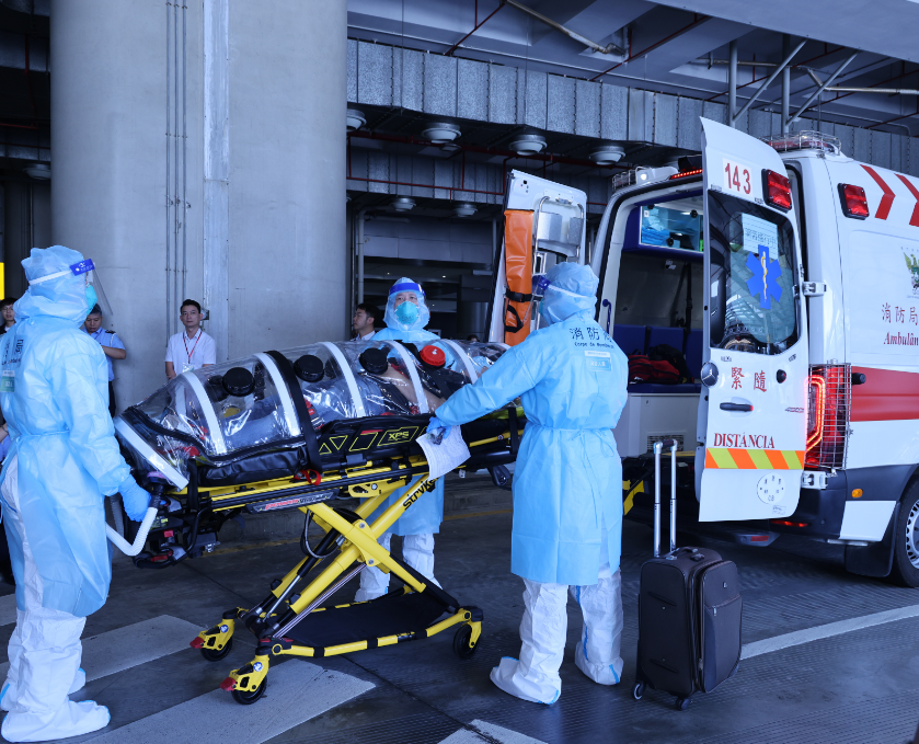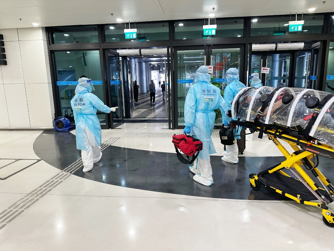 经隔离室医学排查,该人士被判定符合马尔堡病毒病疑似病例定义,演习随即启动转运预案。卫生局向口岸各应急部门通报情况,治安警察局同步启动应急机制,包括通报单位、划定管控区域、确保转运动线封闭可控等,澳门海关则按程序检查旅客行李,消防局人员使用多功能隔离仓将疑似病例转运至负压救护车,送往仁伯爵综合医院公共卫生专科大楼隔离治疗。完成转运后,工作人员对隔离室、运送路线及可能受污染区域彻底消毒,随后解封管控区域,恢复口岸正常运作。
