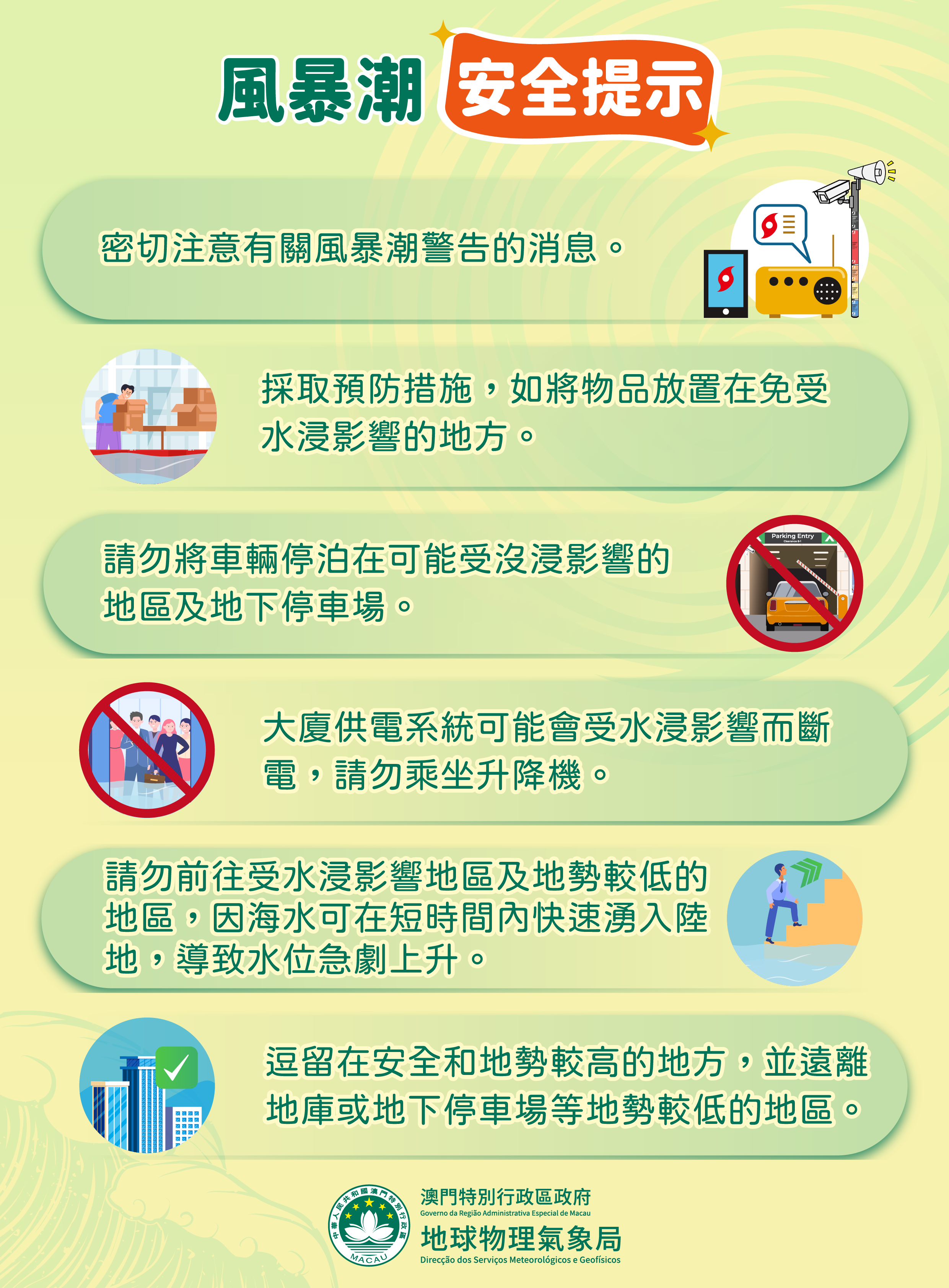 当八号或更高风球生效期间,非必须外出的人士应逗留在安全的室内场所,远离当风的门窗。同时,为应对将出现显着的风暴增水,气象局呼吁市民采取以下措施: