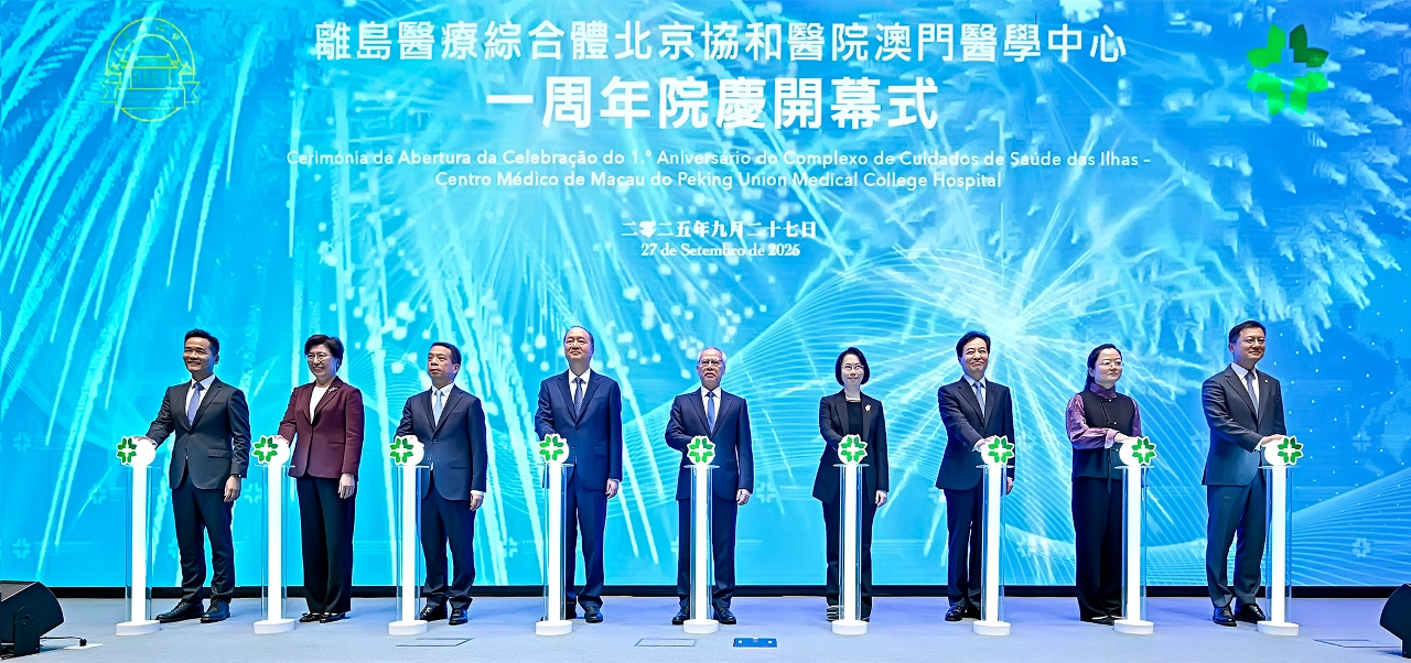 离岛医疗综合体北京协和医院澳门医学中心(下称“协和澳门医学中心”)于今(27)日举行周年院庆开幕式及〝第二届澳门协和学术周〞活动,澳门特别行政区岑浩辉行政长官、中联办郑新聪主任、社会文化司柯岚司长、中联办黄柳权副主任、北京协和医院名誉院长赵玉沛院士、北京协和医院张抒扬院长、国家卫生健康委员会港澳台办张晓博处长、卫生局罗奕龙局长及协和澳门医学中心吴文铭院长共同担任开幕式的主礼嘉宾。