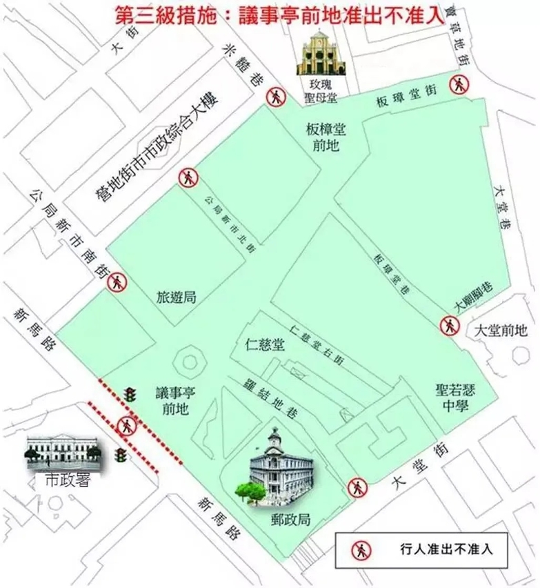 第三级措施:议事亭前地准出不准入。当新马路及议事亭前地人群出现大范围挤拥时,在第二级的基础上,议事亭前地至玫瑰堂整片区域将会视乎实际情况采取局部或全部封闭,届时在区域内的人群可以离开,区域外的人士不可内进(详见附图四)。
