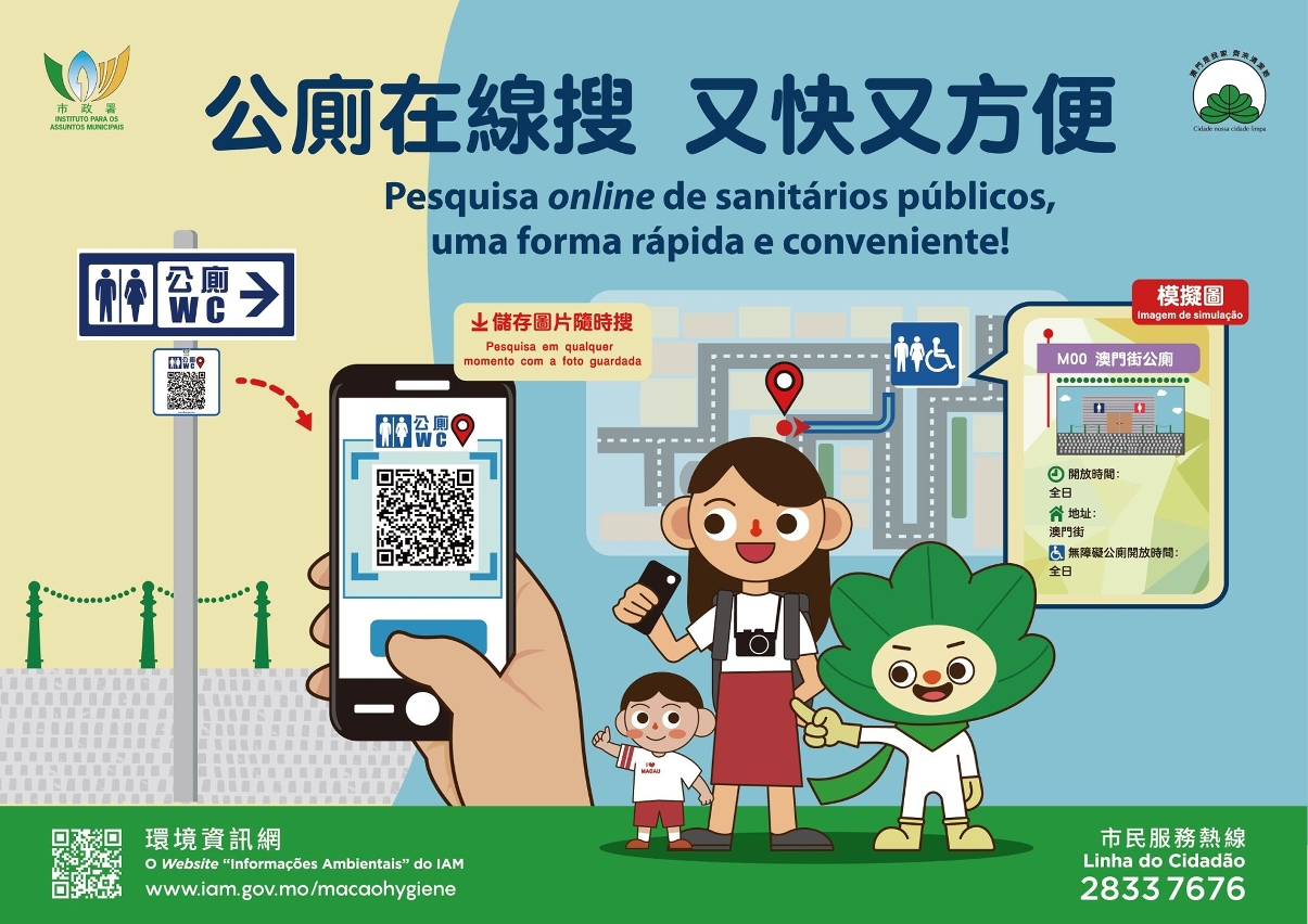 为方便市民及游客寻找就近的公厕,市政署已于全澳各区增设公厕指示柱逾200支,市民及游客只须用手机扫瞄指示柱上的“EasyGo公厕导航”二维码,便可使用导航功能前往最近的公厕。