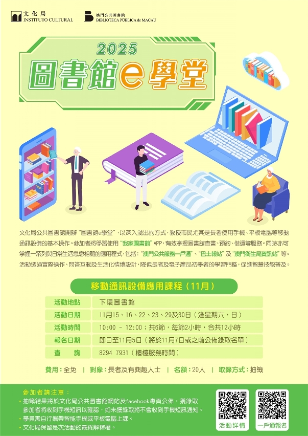 新一期“图书馆e学堂”将于11月15日至30日逢周六、日上午10时至12时在下环图书馆举行,活动共6节,将由导师教授手机及平板电脑等移动装置的基本设定与日常操作,并介绍文化局公共图书馆的“我家图书馆”流动应用程式及其电子服务功能。同时,亦会教导多款实用应用程式的应用,例如“澳门公共服务一户通”“巴士报站”“澳门卫生局资讯站”等。活动透过实际操作、问答互动及生活化情境设计,降低长者及电子产品初学者的学习门槛,让市民轻松掌握使用公共电子服务的能力。