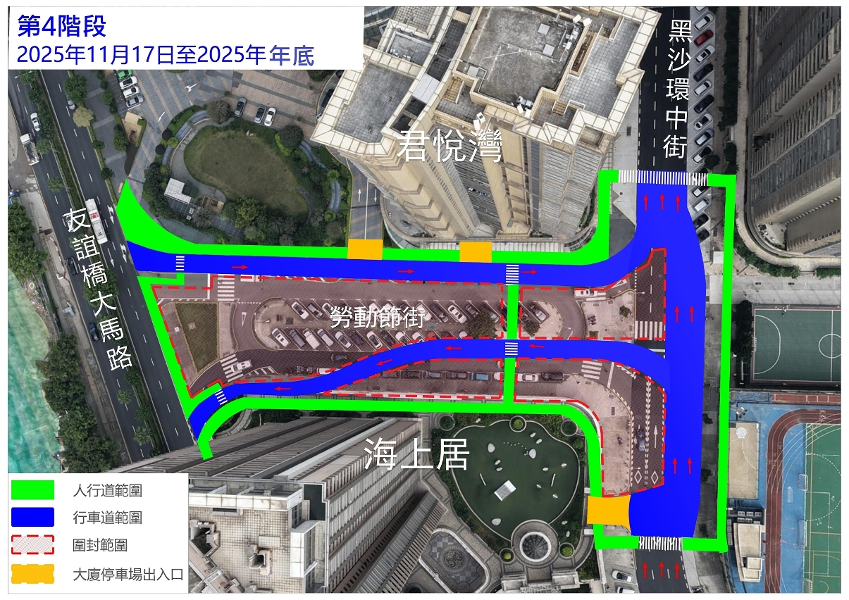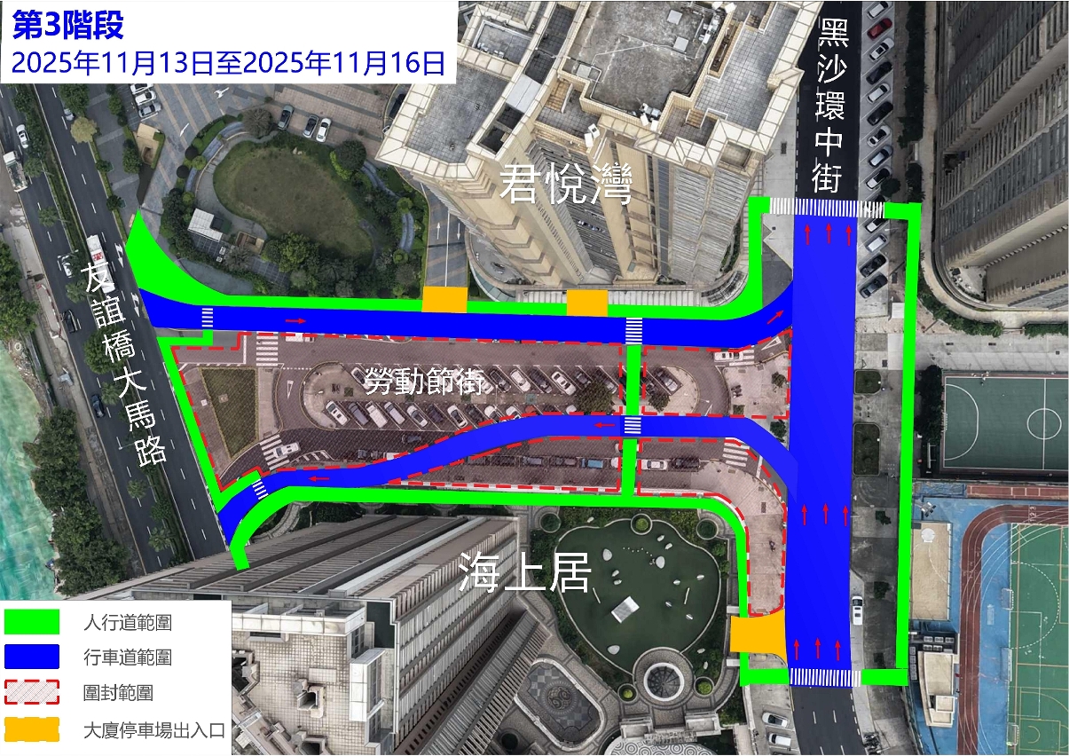 考虑到道路位处繁忙路段且施工时间较长,为减低工程对周边交通的影响,经跨部门协调及与地区社团现场视察及听取意见后,将采取分阶段施工安排(详见附表)。其中,第一、二阶段由10月27日至11月12日,黑沙环中街部份路段将由原来三线行车改为两线行车(详见附图);另外,配合本年大赛车活动,工程将透过调整工序,于赛事期间临时恢复三线行车,以缓解赛车期间的交通压力。