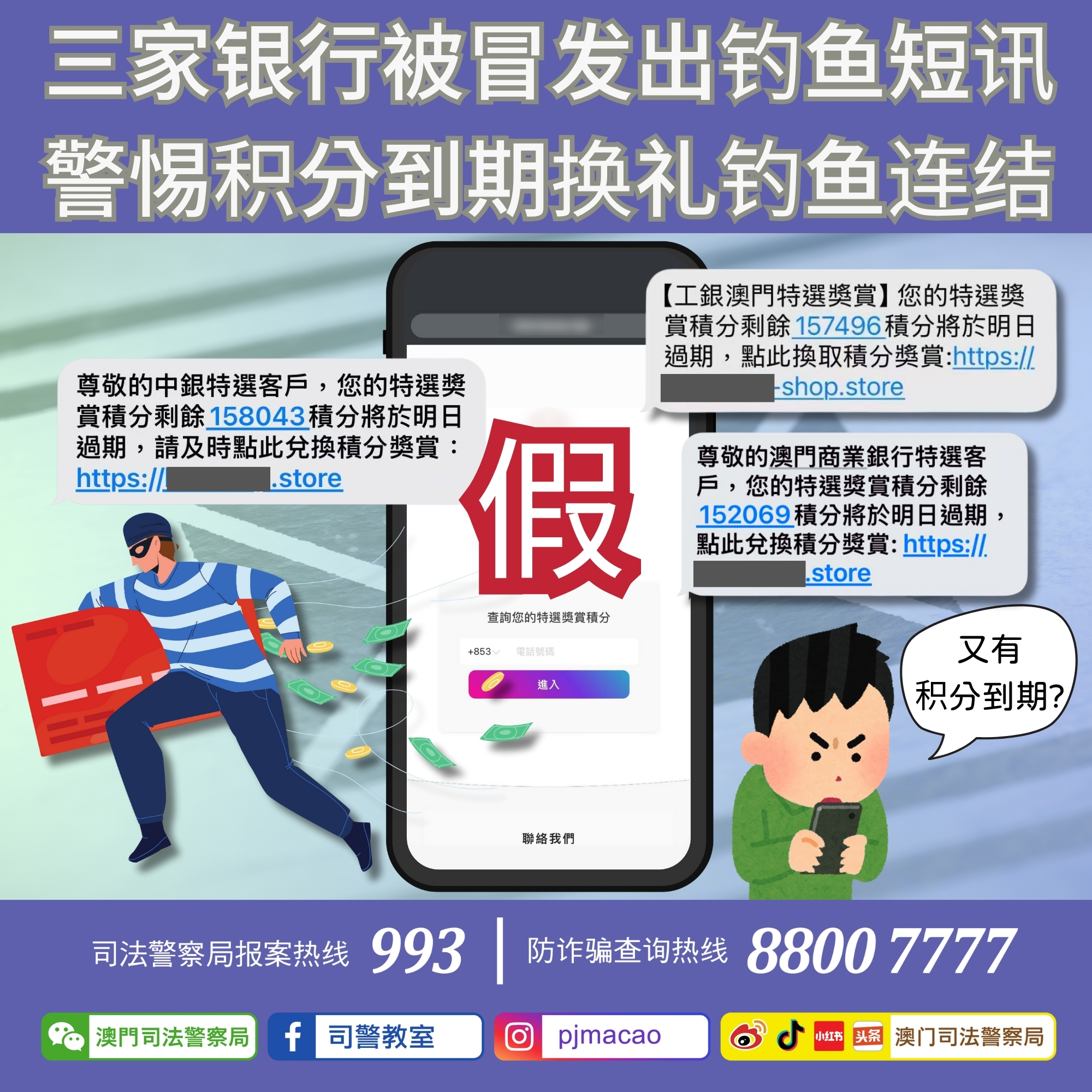 近日,司法警察局发现骗徒先后冒充本澳三家银行,包括工银澳门、澳门商业银行及澳门中银的名义,向市民滥发钓鱼短讯。内容以「特选奖赏积分明日过期」为由,诱使市民点击短讯内附带的钓鱼连结。由于骗徒的钓鱼短讯有可能会混入市民与银行的真实短讯对话框内,市民务必提高警觉。