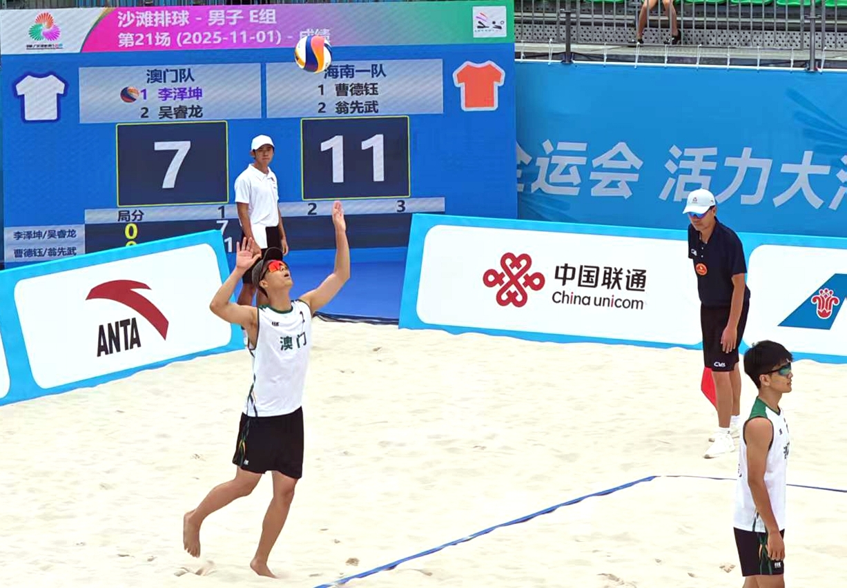 在香港赛区进行的沙滩排球展开第二轮小组赛,澳门男子队李泽坤(LEI CHAK KUAN)/吴睿龙 (NG IOI LONG)以局数0比2负海南队;女子队梁安盈(LEONG ON IENG)/罗咏心(LAW WENG SAM)的第二轮小组赛于截稿前仍在进行中。