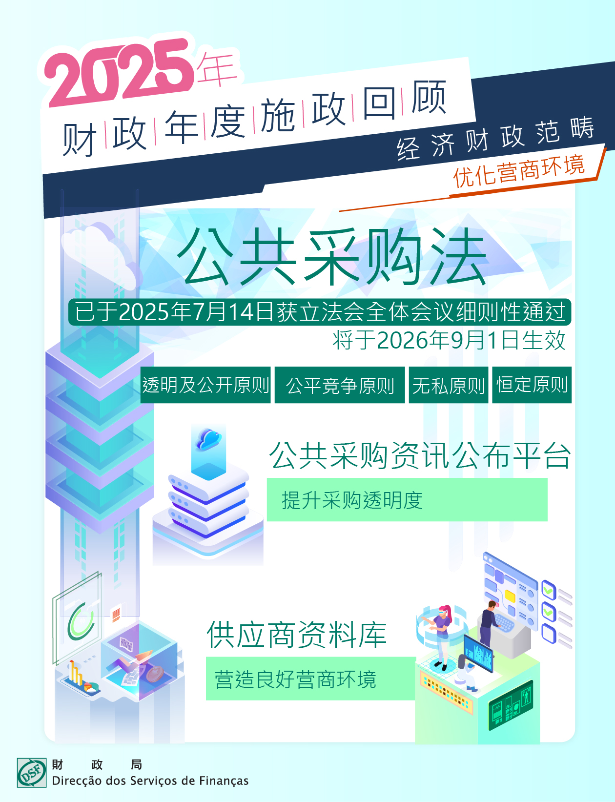 《2025年财政年度施政方针》提出推进《公共采购法》的立法工作,有关法案已于2025年7月14日获立法会全体会议细则性通过,并将于2026年9月1日生效,标志着本澳公共采购制度将迈入更趋现代化、规范化的新阶段。