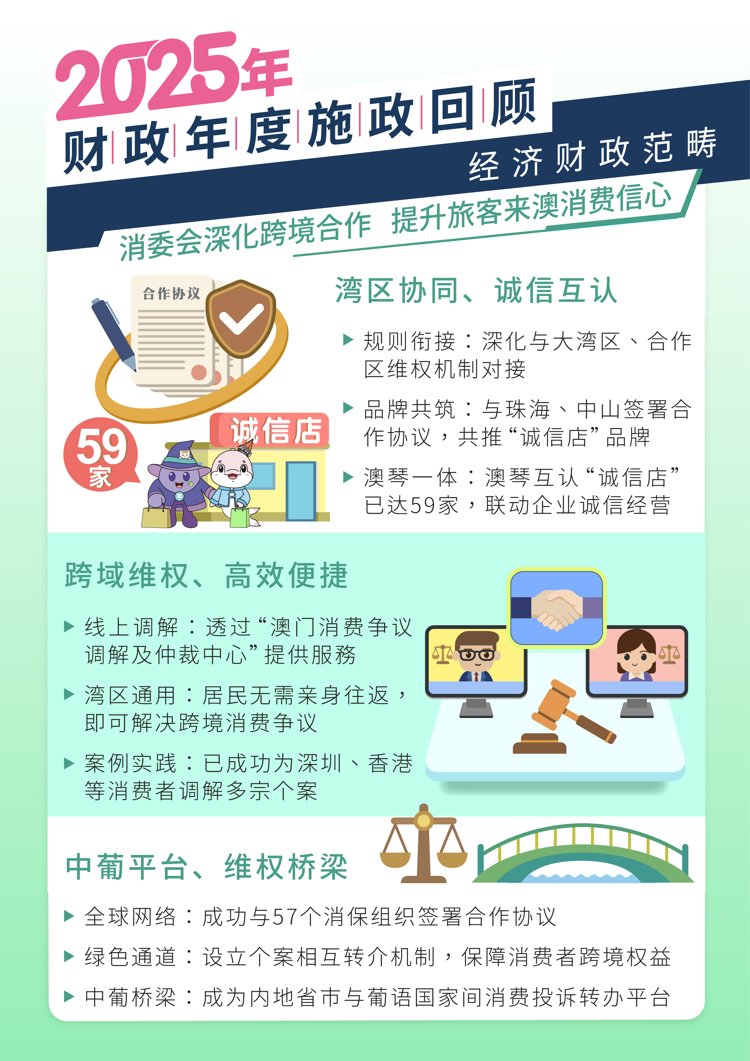 为落实2025年施政报告提出维护消费权益,深化区域消保合作的方针,澳门消费者委员会(下称“澳门消委会”)积极加强与各地消费者组织合作,透过专业便捷的服务切实保障消费者合法权益,进一步提升旅客来澳消费的信心,助力澳门“世界旅游休闲中心”建设,促进澳门经济适度多元发展。
