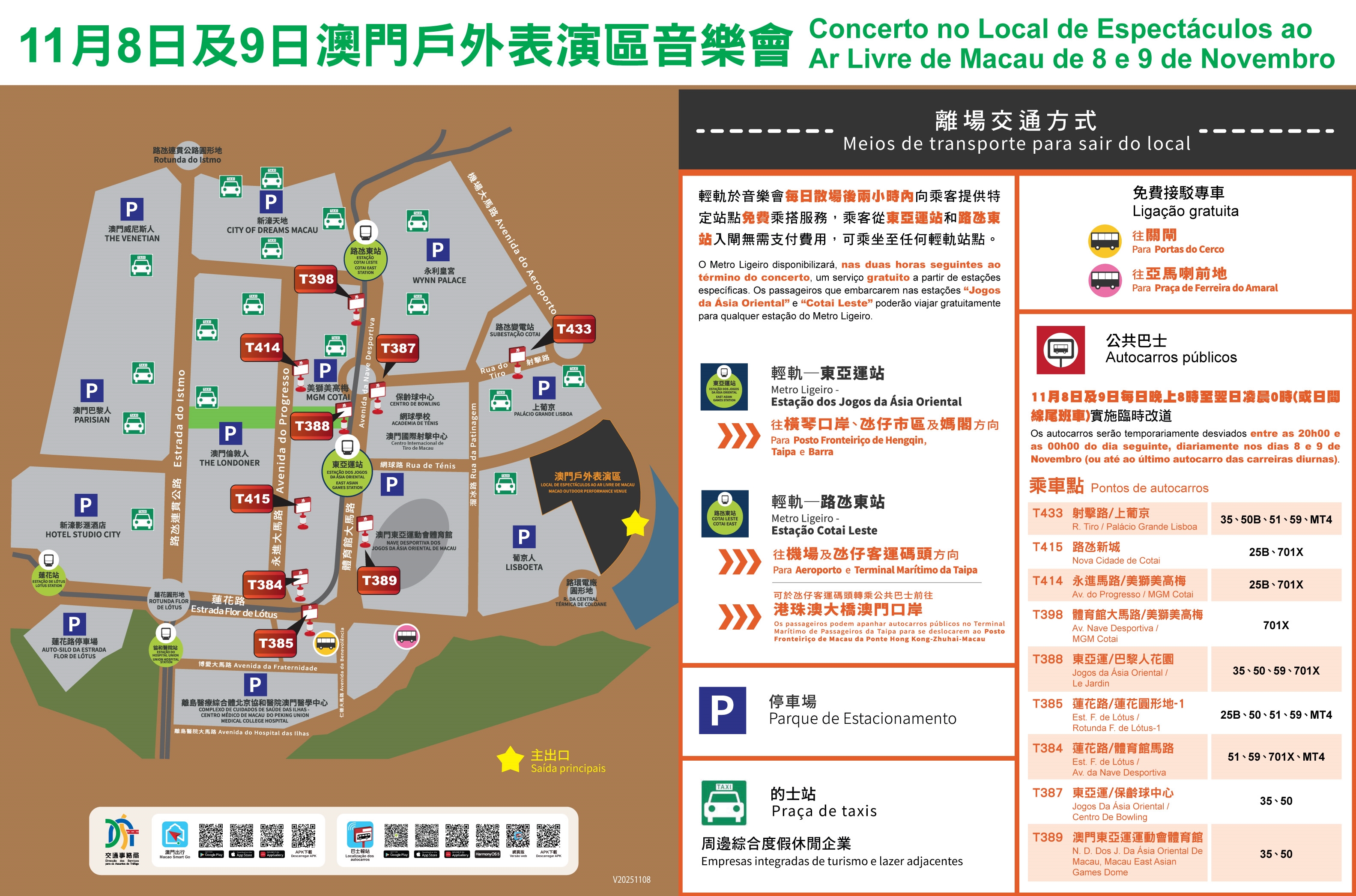 交通事务局建议观众使用公共运输,驾驶者可停泊于表演区外的公共停车场或综合度假休闲企业停车场,并请预早规划行程,遵从现场指示。详情可浏览交通事务局网站(连结:https://www.dsat.gov.mo/dsat/subpage.aspx?a_id=1762478733)。