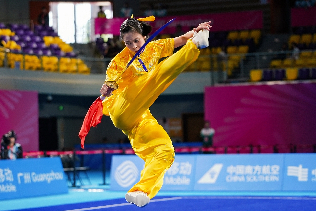 武术套路上演团体赛,经过男子剑术、女子刀术、男子枪术、女子棍术,男子三人徒手对练及女子二人对练共6个项目比拼后,澳门队获得总分56.852分,最终排名第13位,并已完成本届所有赛事。