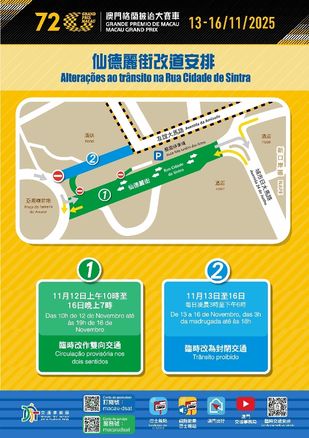 当中,11月12日(周三)至16日(周日),亚马喇前地与城市日大马路之间一段仙德丽街临时由单向改为双向交通、福海花园与新雅马路行车天桥之间的一段新雅马路临时改作反方向通车。至于其他于赛事期间每日凌晨至傍晚时段封闭之赛道及周边路口,会因应实际情况,于当天的赛事结束后尽早解封。