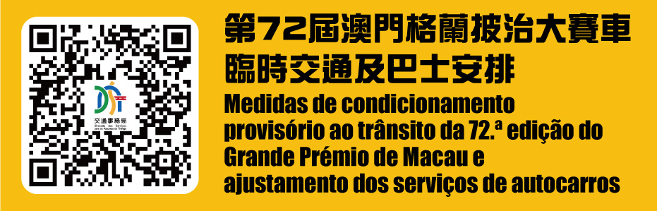 因应体育局举办第72届格兰披治大赛车,11月12日(周三)至16日(周日),赛道及周边道路分阶段实施多项临时交通管制措施,11月13日(周四)至16日(周日)期间合共52条巴士路线需作临时安排,并设两条免费穿梭巴士路线。为缓解赛道周边交通压力,政府多个部门透过协作部署,开通B匝道和调整部份道路工程的施工安排,改善道路通行能力。具体的临时交通及巴士调整可浏览交通事务局专页(https://www.dsat.gov.mo/dsat/subpage.aspx?a_id=1761559294)。