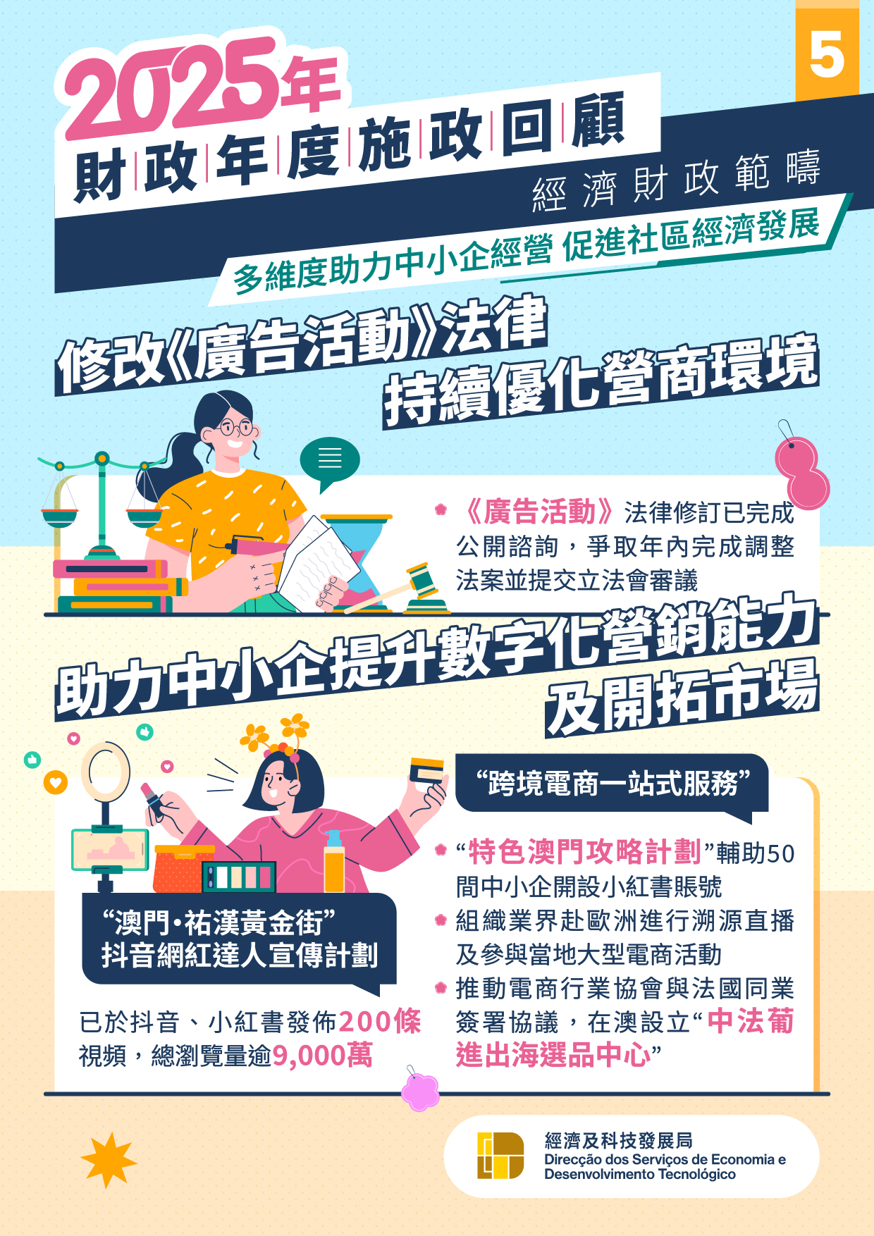 为落实2025年施政报告中关于持续优化营商环境,促进社区经济发展的目标,特区政府采取多方面措施,助力本澳企业提升管理效率和竞争力,并引入不同元素增添社区吸引力,加强宣传推广,为社区拓流引客带动消费。同时提供不同的财政支援措施,支持中小企业持续经营及创新发展。