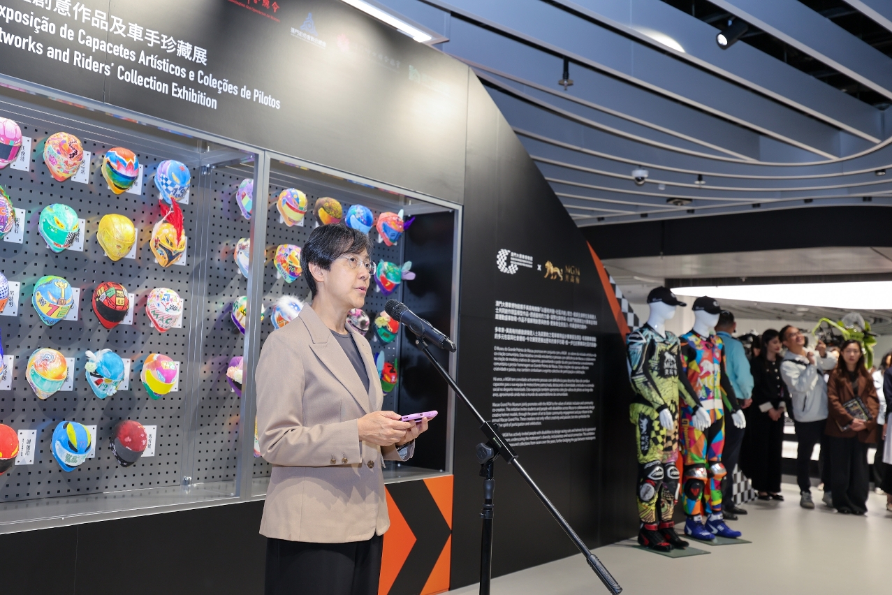 “澳门大赛车博物馆X美高梅:《共速共艺》全民头盔模型创意作品及车手珍藏展”今(12日)开幕。旅游局局长文绮华、美高梅中国控股有限公司总裁及首席营运官王志琪、澳门工会联合总会会长何雪卿、澳门妇女联合总会会长刘金玲、澳门街坊会联合总会副会长姚嘉聪及澳门扶康会会员大会主席飞迪华,联同两位出战今届澳门格兰披治大赛车的车手主持开幕仪式。