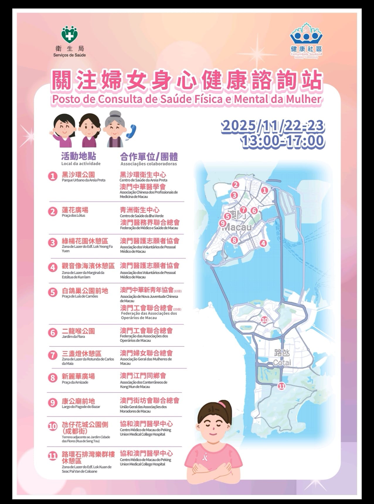 11月22及23日(即本周六、日)的13:00至17:00,卫生局联同离岛医疗综合体北京协和医院澳门医学中心(下称“协和澳门医学中心”)、本澳10个社团和高等院校等,于全澳各区共设置11个“关注妇女身心健康咨询站”(参见以下图文包)。咨询站内分别有卫生局医疗人员和社区医疗人员提供健康咨询及疑难解答等,本澳两所高等院校护理学系的学生亦透过参与活动作为实习机会。健康咨询站活动除提供专业医疗咨询外,亦有互动游戏及健康宣传品的派发,向居民宣传有关妇女两癌筛查、心理健康及孕产妇健康管理等资讯,费用全免,参与现场活动后可获发小礼品,欢迎居民踊跃参与。