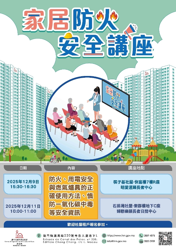 房屋局本周开始到各区社会房屋的长者中心举办“家居防火安全”讲座,由消防局人员主讲,首两场讲座约200人出席。余下两场将于12月中旬到筷子基区及石排湾区举行,欢迎社屋租户踊跃报名参加,同时,亦派员还到各社屋楼宇向租户派发宣传单张,以加强租户之防火意识。