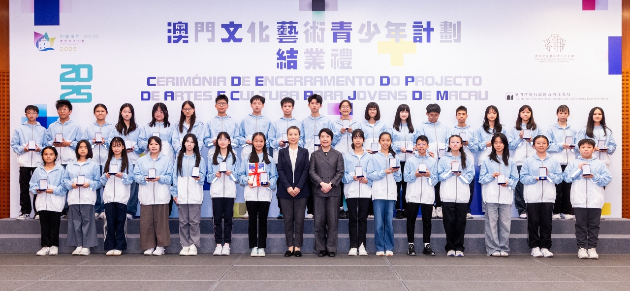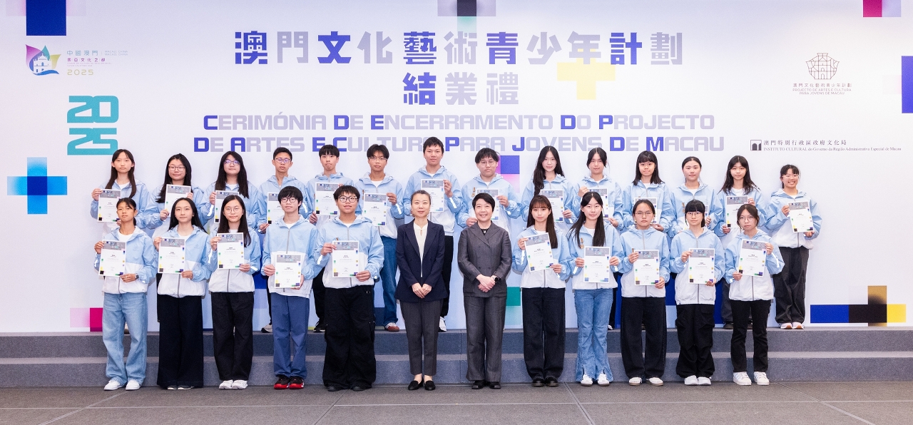 由文化局主办的2025“澳门文化艺术青少年计划”今日(11月30日)在澳门文化中心会议室举行结业礼,文化局局长梁惠敏,中央人民政府驻澳门特别行政区联络办公室宣传文化部副部长白冰,文化局文化传播处处长梁静仪,澳门艺术博物馆代馆长吕咏儿,教育及青年发展局学生综合发展处职务主管萧兆霞,课程导师简佩茵、蔡嘉琳、薛达卫、叶志坚及孙嘉鸣等出席。