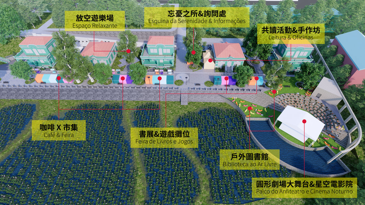 户外图书馆、艺文书展、咖啡及文创市集、游戏摊位、放空游乐场、忘忧之所 |