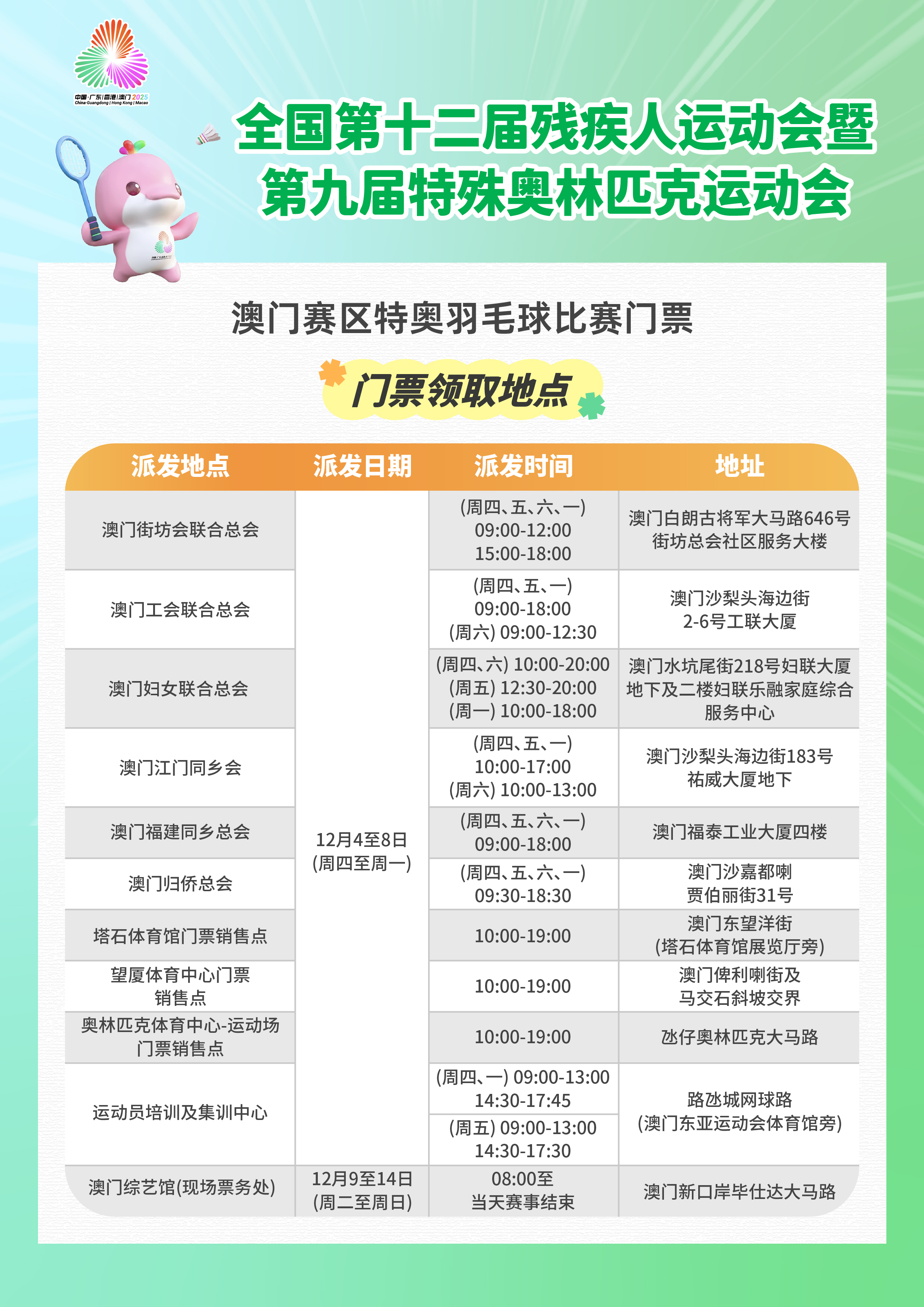为惠及市民大众,让更多观众走进赛事现场为运动员加油打气,促进社会共融、营造热烈的赛事氛围,市民及旅客可于12月4至8日期间在指定地点(详见附表)的开放时间内免费领取特奥羽毛球比赛门票,每人每次最多可领取2张门票,不设划位,领完即止。赛事期间(12月9日至14日),市民及旅客亦可于澳门综艺馆现场票务处领取门票进场,持票人士可在比赛开始前一小时入场。