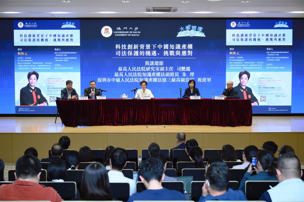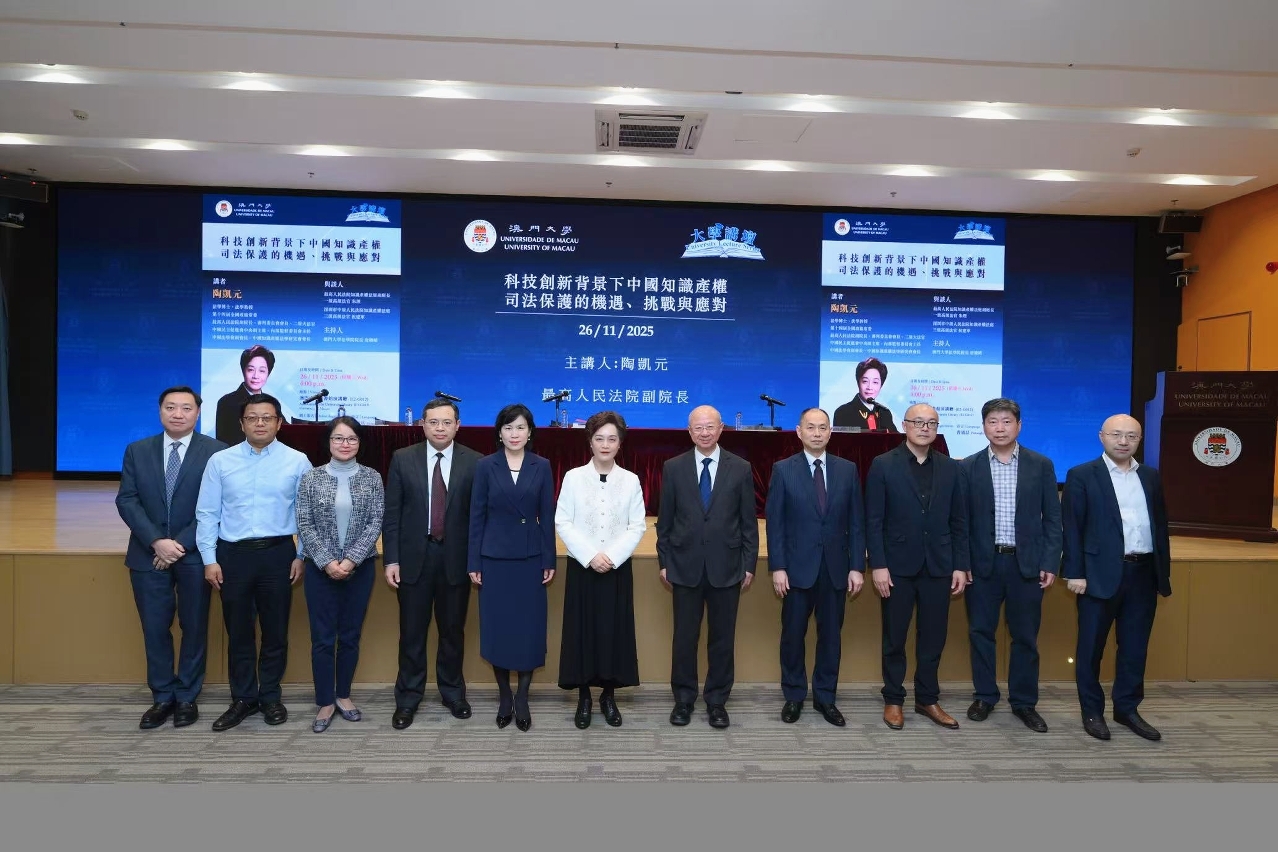 澳门大学举行“大学讲坛”,由最高人民法院副院长、二级大法官陶凯元以“科技创新背景下中国知识产权司法保护的机遇、挑战与应对”为题发表演说,深入探讨中国知识产权司法保护的新形势、新任务及司法应对,吸引澳门社会各界参与。