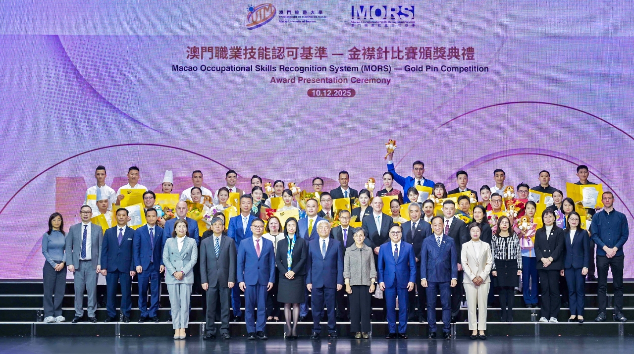 澳门旅游大学于 2025 年 12 月 10 日举行“澳门职业技能认可基准(MORS)”金襟针比赛颁奖典礼。出席嘉宾包括澳门旅游大学校董会主席陈泽武、澳门旅游大学校长黄竹君、澳门特区政府旅游局局长文绮华、劳工事务局局长陈元童、金沙中国有限公司行政副主席王英伟、澳门酒店旅业职工会会长李宝来及澳门酒店协会理事长钟友雄。