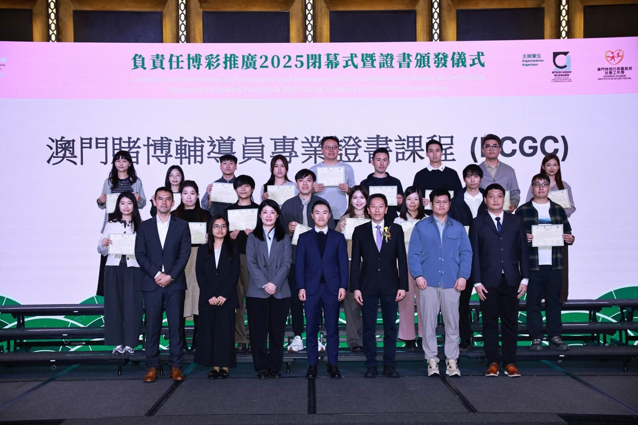 在闭幕仪式上,主办单位向15间经负责任博彩工作小组评审获“负责任博彩执行模范单位”之娱乐场及其他博彩场所授予资格奖座,以及向175名分别完成“澳门赌博辅导员专业证书课程”、“澳门负责任博彩指导员证书课程”及相关导师证书课程人士颁发证书,持续推动本澳负责任博彩及赌博失调防治体系朝向专业化发展。会场亦设有摊位展示系列活动成果,为与会者搭建经验交流平台。