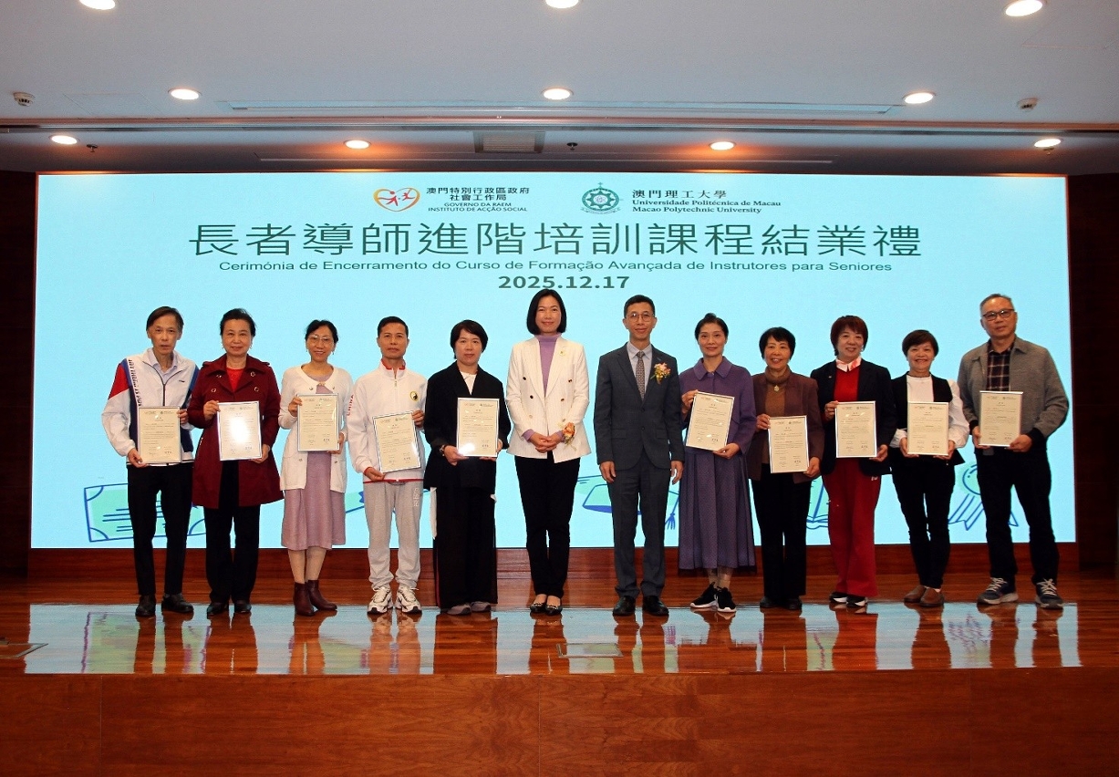 由社会工作局与澳门理工大学长者书院合办的“长者导师进阶培训课程”,于12月17日在澳门理工大学举行结业礼,一众长者学员完成课程并获发结业证书。