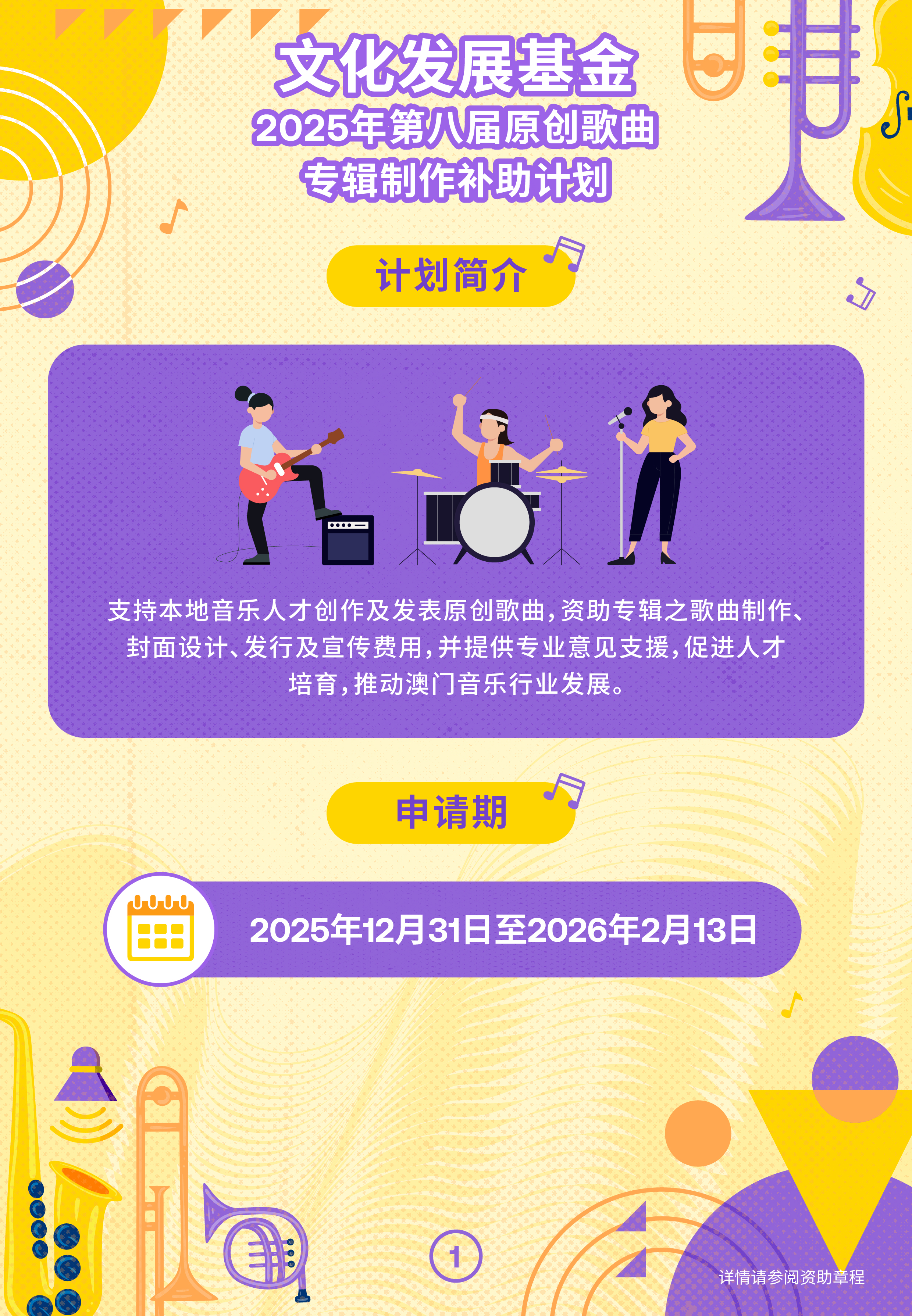 文化发展基金推出“第八届原创歌曲专辑制作补助计划”,培育本地音乐人才,推动澳门音乐产业发展,为创作者提供发表原创歌曲的机会,并透过资助制作、设计、发行及宣传,以及专业意见支援,助力累积优秀作品,拓展市场。