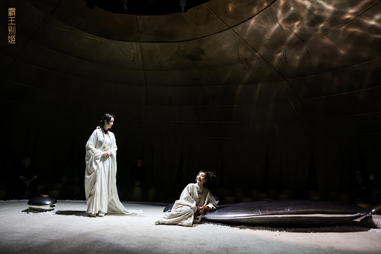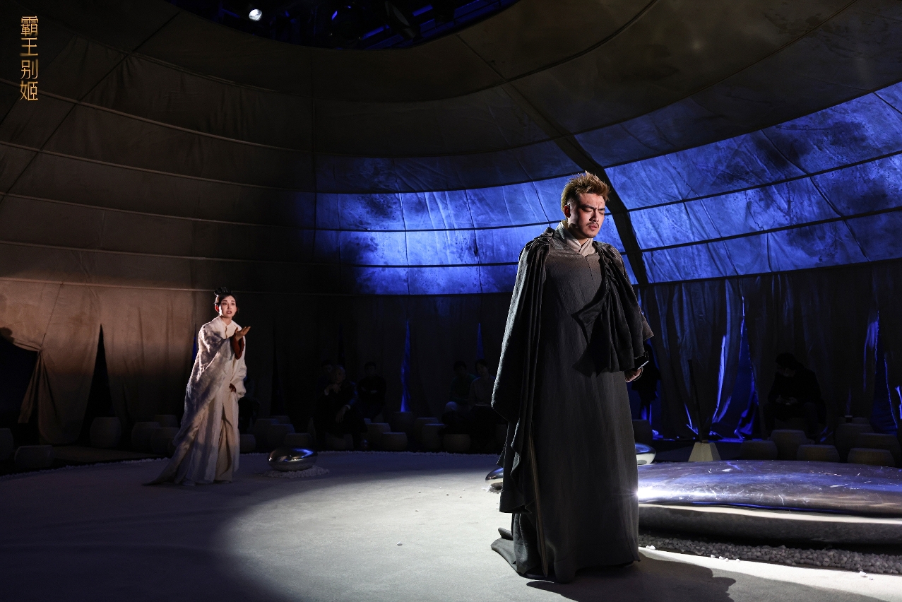 沉浸式话剧《霸王别姬》为首届“中华文化演出季”演出精品之一,由诺贝尔文学奖得主莫言担任编剧,演出打破传统历史剧叙事框架,通过虞姬与吕雉的多次会面和时空交错的对话结构,探讨权力、生存、责任等永恒命题。透过沉浸式的舞台设计,让观众置身四面围合的“楚军营帐”,坐在高低错落的蒲团草凳上近距离围观剧中人物的爱恨纠葛。