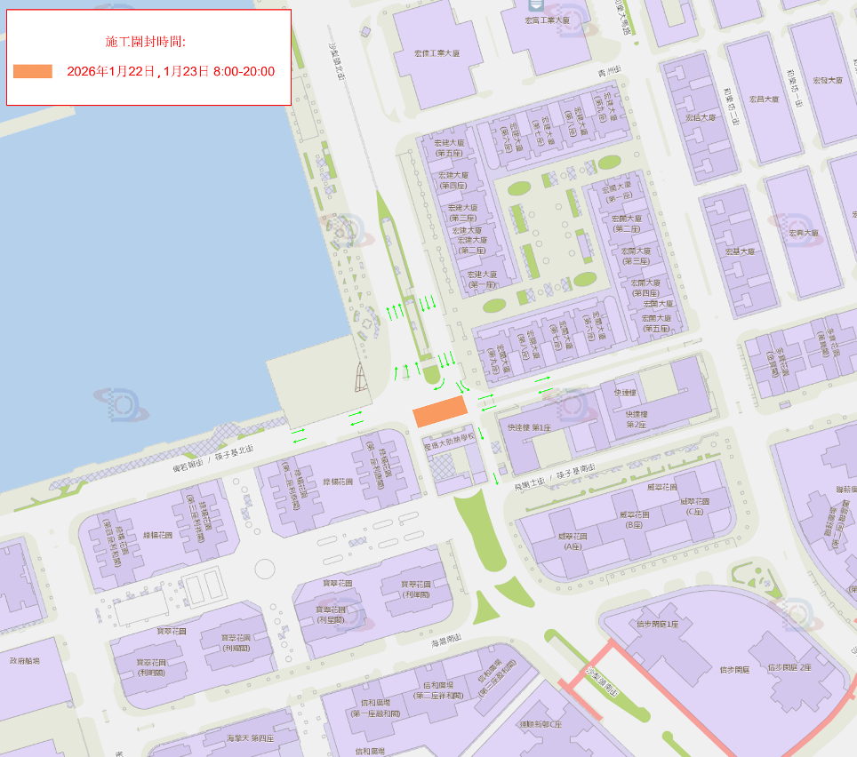 - 2026年1月24日上午10时至下午4时,介乎俾若翰街至海湾南街的一段沙梨头南街将实施封闭交通(见附图2),期间车辆无法经沙梨头南街直接前往俾若翰街或沙梨头北街,需改为经海湾南街及船澳街前往,而原来途经该处的公共巴士将实施临时改道,但不影响停靠站点,敬请市民留意。