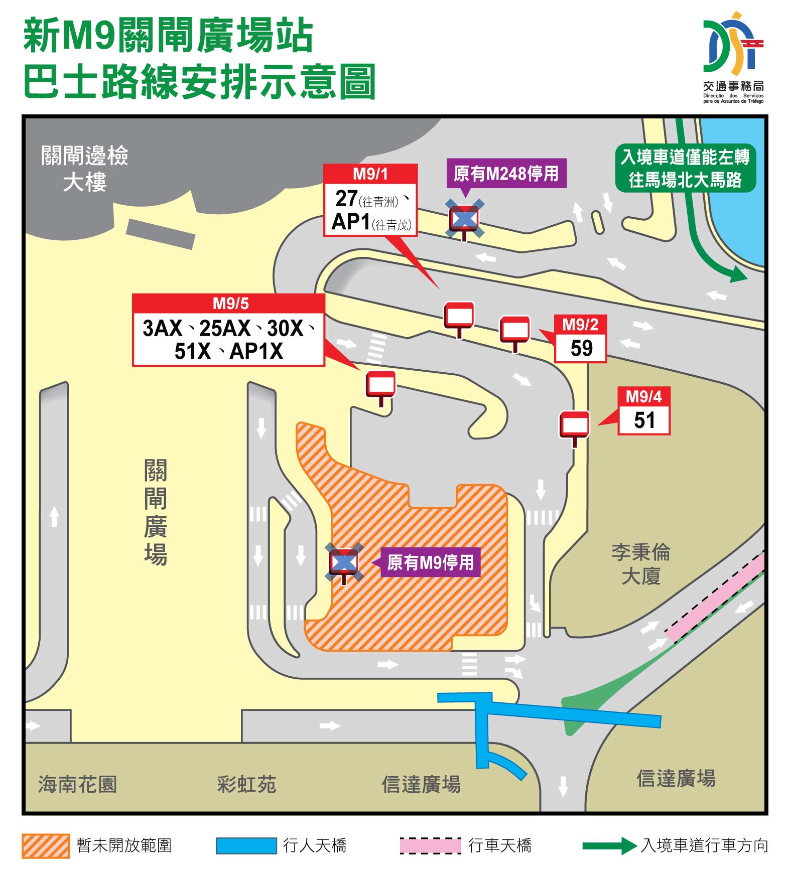 “关闸广场"站与“关闸东侧上落客区"站合并,并迁移至新建的原特警总部上落客区内,停靠路线包括:3AX、25AX、27(往青洲)、30X、51、51X、59、AP1(往青茂)及AP1X。 |