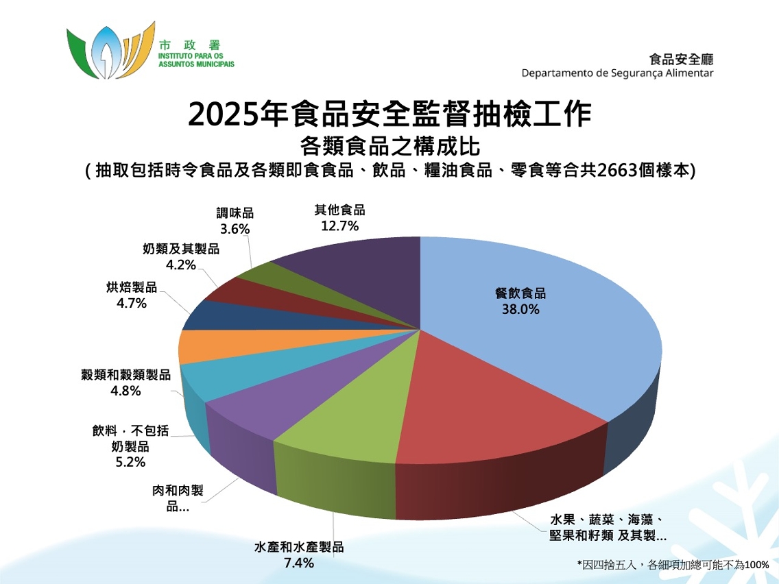 总结去年市政署于市面抽检共2,663个食品样本,包括170个时令节日食品样本,1,481个预包装、散装及鲜活食品样本及1,012个餐饮食品样本,当中有8个样本未能通过检测,其余样本未见异常,整体合格率达百分之99以上。市政署已跟进不合格样本个案,包括勒令商户下架及停售相关产品,并追查问题食品来源等,有关讯息早前亦已透过新闻稿发布。